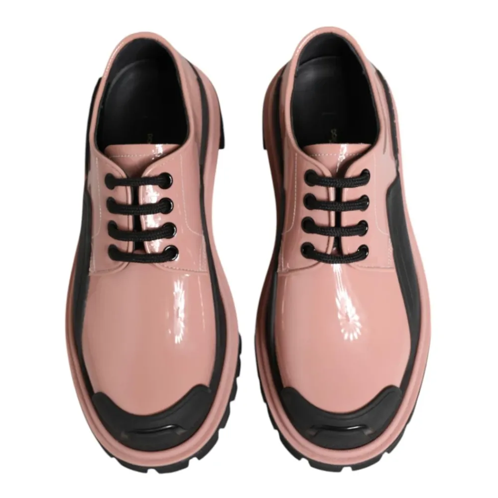 Forhøj din stil med disse Dolce & Gabbana Light Powder Pink Black Leather Lace-Up Shoes til kvinder. Fremstillet af 100% kalvpatentlæder, tilbyder disse flade sko en perfekt blanding af elegance og moderne stil. Den delikate pudderrosa farve med sorte accenter gør dem til et alsidigt tilbehør til enhver garderobe. Snørebåndsdesignet sikrer en god pasform og tilføjer et strejf af sofistikering til dit outfit.
