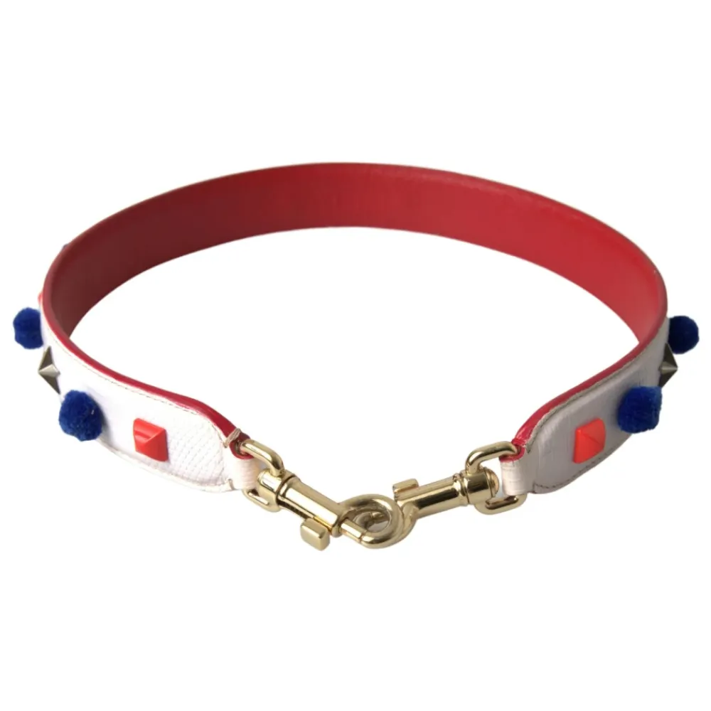 Forstærk din håndtaske med et strejf af luksus og personlighed med denne Dolce & Gabbana skulderrem. Fremstillet i Italien af 100% læder, har den en iøjnefaldende hvid base prydet med livlige multifarvede nitter og de ikoniske D&G logo detaljer. Tilføj stil og alsidighed til din accessories samling med dette statement stykke. Farve: Hvid og Rød. Mål: 68cm x 3cm.