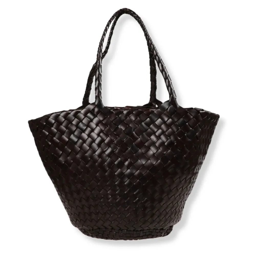 Dragon Diffusion Egola Bag er en håndvævet lædertaske med en kurv-silhuet og flettede tophåndtag, designet til hverdagsbrug med et raffineret, håndværksmæssigt look. Nøgleattributter: Sort | Mørkebrun | Læder | Åben top | Flettede tophåndtag | Kurvformet silhuet | Håndvævet læderkrop | Flettede øvre håndtag | Sammensætning & pleje: Læder