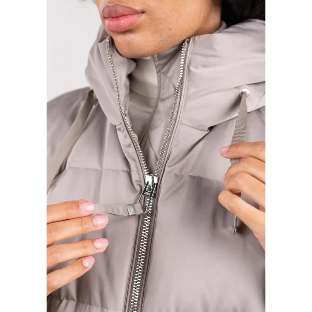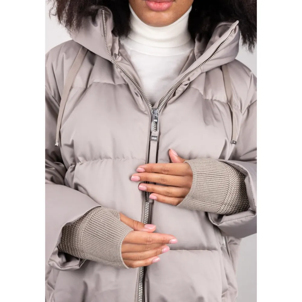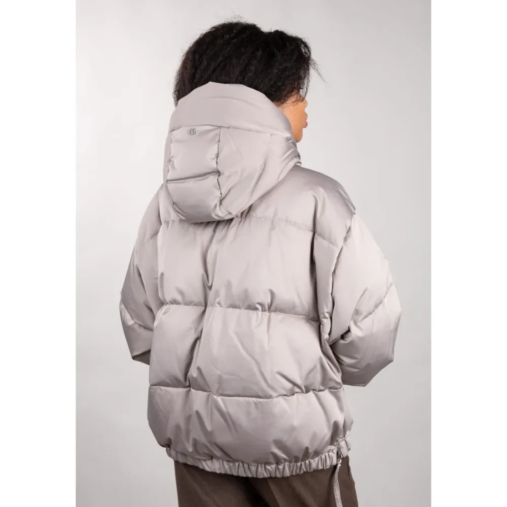 Duno kort oversized dunjakke fremstillet i teknisk satin, med en justerbar hætte og flere lynlåsdetaljer for alsidig brug. Vigtigste egenskaber: Grå | Sabbia bagnata | Teknisk satin | Vandafvisende finish | Strækkomfortstof | Dunfyld for termisk isolering | Vejrbestandig | Justerbar hætte med snøre | Sideslidser med lynlåslukning | Skjult elastisk kant for at stramme kanten ind | Lange uldstrikkede manchetter, der kan omdannes til vanter via tommelfingerhul | Paspolerede sidelommer med skjult trykknap | Dobbeltlynlås foran med træk | Kort oversize silhuet | Satinlignende, silkeagtigt udseende | Lange strikmanchetter med tommelfingerhul | Underlynlås med zigzag-syning | Dimensioner og pasform: Oversized pasform | Varme komfortvurdering tilgængelig (Duno-skala) | Sammensætning og pleje: Teknisk satin (ydermateriale) | Dun (fyld) | Uld (manchetter)