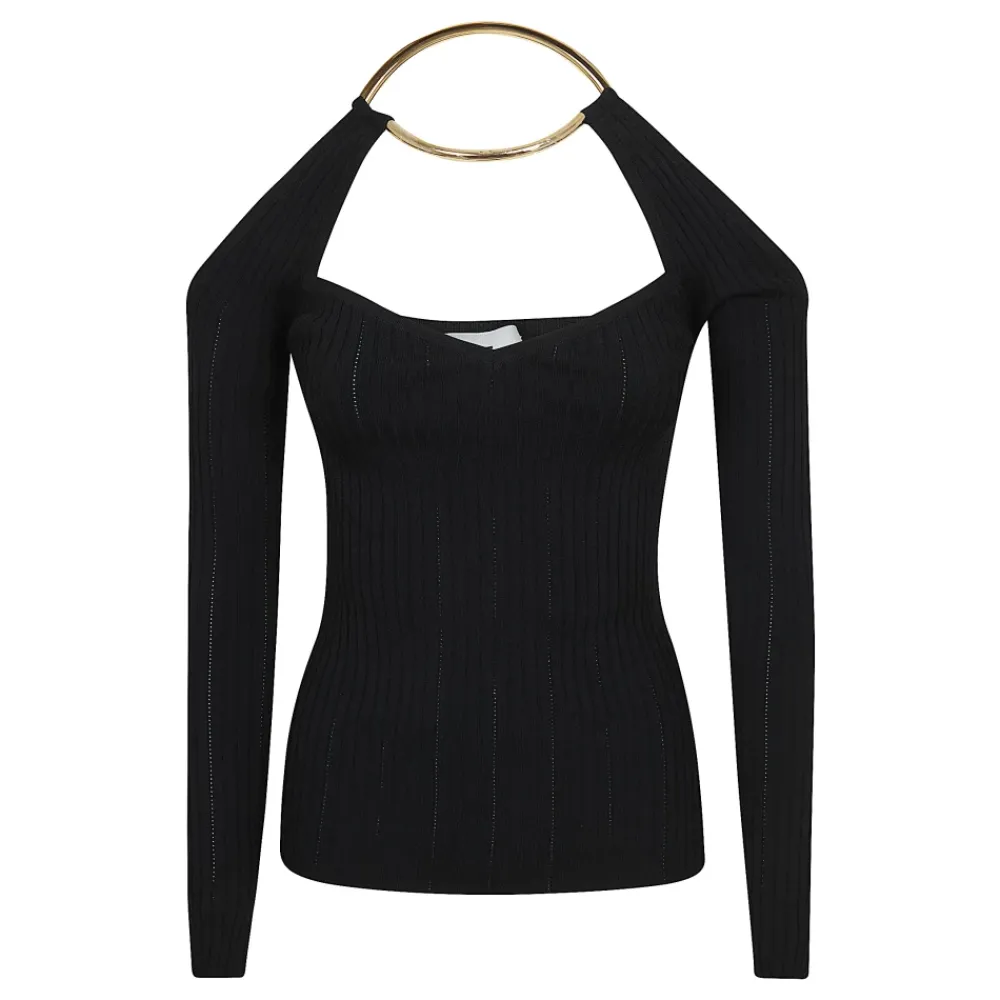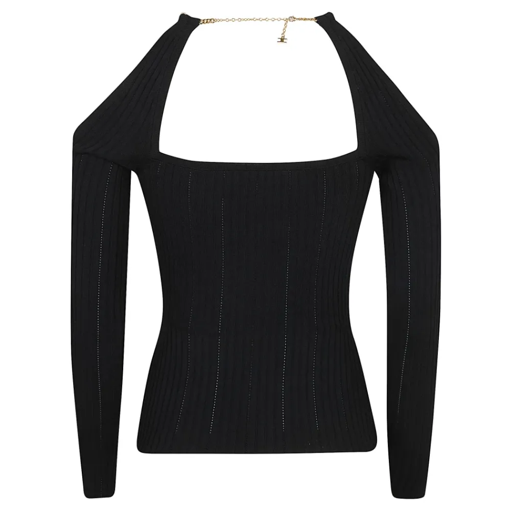 Elisabetta Franchi strikket top med juveldetalje – en off-shoulder strikket top defineret af en guldfarvet metaljuvel ved halsudskæringen. Ideel til elegante aftener og raffinerede hverdagslooks. Nøgleattributter: Sort | Viskose | Off-shoulder halsudskæring | Lange ærmer | Guldfarvet metaljuveldetalje | Ajour ribstrik | Logo på juveltilbehør | Dimensioner og pasform: Længde 60 cm (IT størrelse 40) | Sammensætning og pleje: 64% Viskose | 33% Polyamid | 3% Elastan