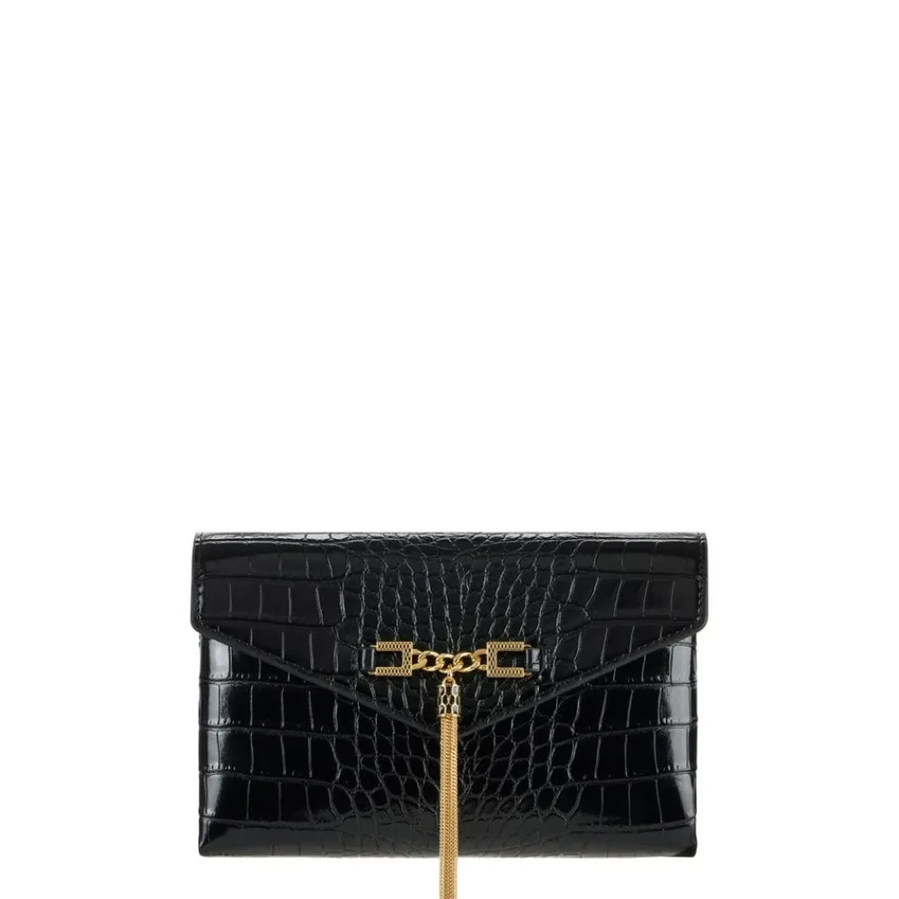 Elisabetta Franchi Skuldertaske med Groumette-kæde kombinerer en kompakt silhuet med krokodilleprint med en guldfarvet groumette-kæderem og logokvast, perfekt til styling fra dag til aften. Vigtigste egenskaber: Sort | Polyurethan | Skulderrem med guldfarvet metal groumette-kæde | Krokodilleprint tekstur | Kompakt minimalistisk form | Guldfarvet metallogo og kvast detalje | Mål & pasform: 14 x 22 x 3,5 cm | Sammensætning & pleje: 60% Polyurethan | 40% Polyester