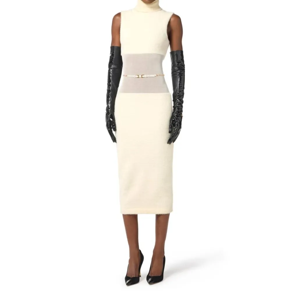 Elisabetta Franchi Strikket kjole med bælte er en ærmeløs midi med rullekrave, der kombinerer en blød pelslignende strik med en gaze-vævning i taljen. Kædebæltet med logo fremhæver silhuetten for et raffineret look fra dag til aften. Vigtigste egenskaber: Beige | Milk | Polyamid | Bælte med kæde og logo | Rullekrave | Ærmeløs | Længde til midt på læggen | Pelslignende tekstur | Gaze-vævning i taljen med transparent detalje | Mål & pasform: Længde 115 cm (IT størrelse 40) | Slim fit | Sammensætning & pleje: 83% Polyamid | 17% Bomuld