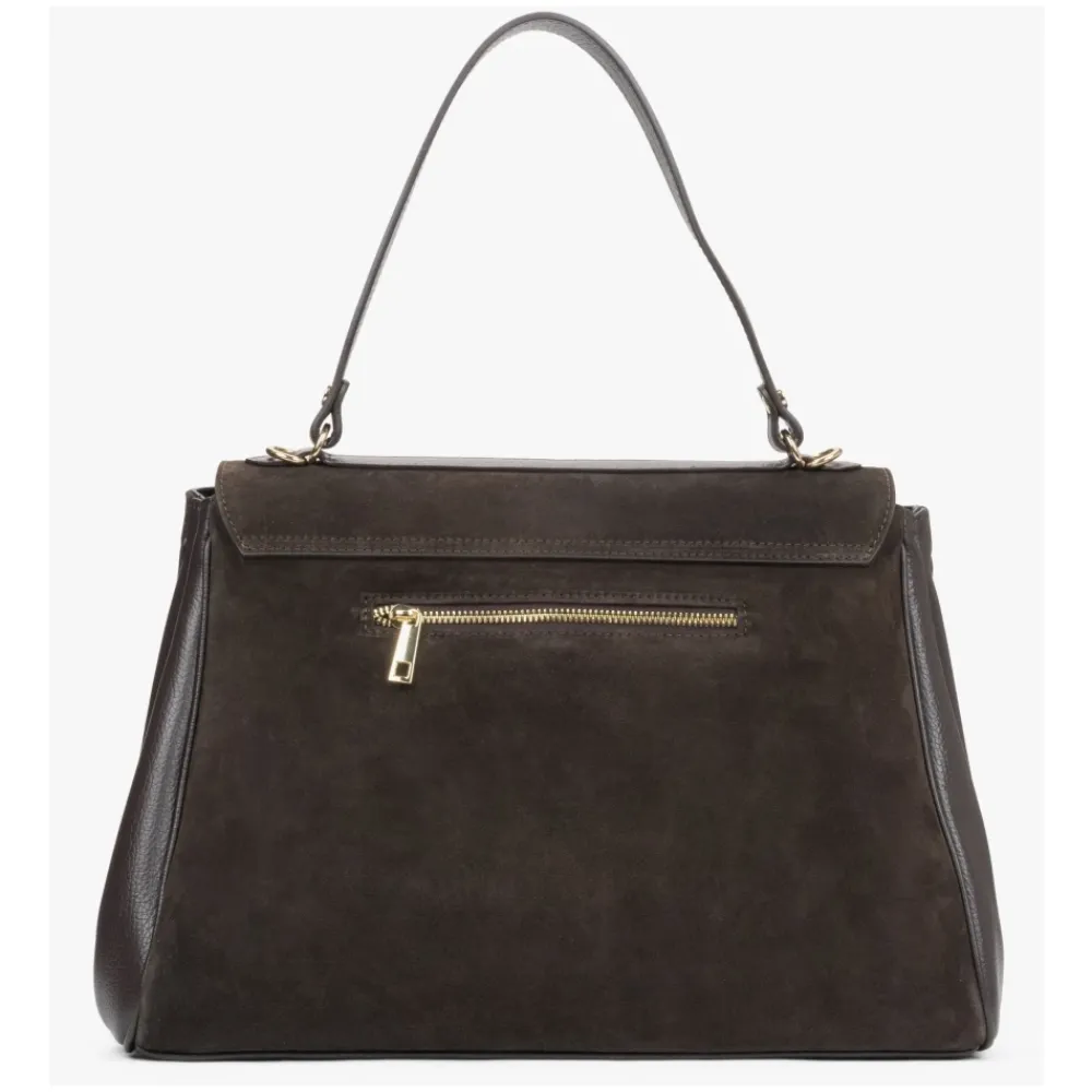 Estro Saddle Satchel Bag kombinerer førsteklasses italiensk velour og læder for en raffineret, organiseret taske, der er velegnet til både hverdagsbrug og særlige lejligheder. Nøgleattributter: Mørkebrun | Velour og læder | Holdbar konstruktion | Justerbar, aftagelig rem | To rum | To lommer | Spænde lukning | Inkluderer anti-dust pose | Saddle satchel silhuet | Guldfarvet hardware | Velour og læder finish | Dimensioner og pasform: Længde: 47 cm | Højde: 24 cm | Bredde: 10 cm | Håndholdt rem maks. længde: 46 cm | Skulderrem maks. længde: 100 cm | Håndholdt og skulderbæremuligheder | Sammensætning og pleje: Ægte italiensk velour | Ægte italiensk læder | Tekstilforing