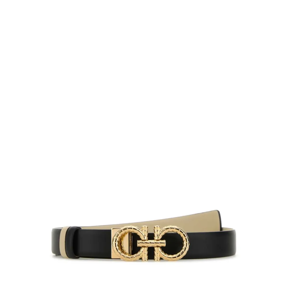 Opgrader din stil med Salvatore Ferragamo Vendbar Sort Læderbælte. Dette alsidige tilbehør, med en højde på 2,5 cm, er perfekt til at fuldende ethvert look. Produkt detaljer: Sort | Kalveskindslæder | Vendbar | Gylden Metalfinish | Sammensætning og pleje: 100% Kalveskindslæder