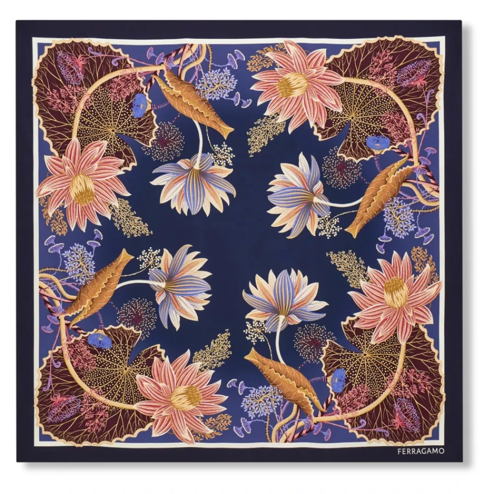 Ferragamo fo ninfee er et silketørklæde, der tilføjer outfits en elegant farve. Det tilbydes i en flerfarvet palet og passer til en række forskellige stylinglooks. Vigtigste egenskaber: Flerfarvet | Ny marineblå | Silkeagtig tekstur