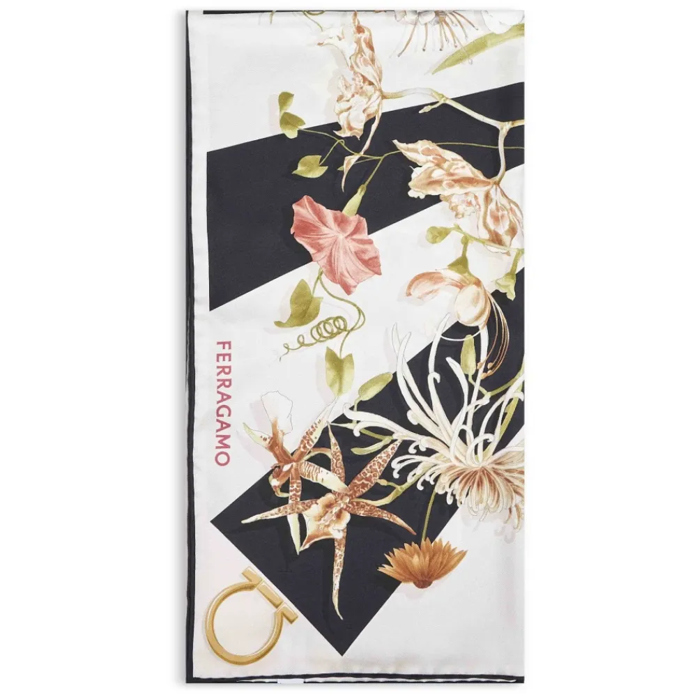 Ferragamo Gaia Print silketørklæde kombinerer et levende pæon- og orkidémotiv med signatur jacquard Gancini-detaljer for et poleret og alsidigt tilbehør. Nøgleattributter: Multicolor | Sort | Elfenben | Silke | Kontrasterende jacquard signatur i bunden | Jacquard Gancini-detaljer i hjørnerne | Multicolor pæon-, orkidé- og eksotisk planteprint | Udstrålende optisk baggrund | Firkantet model | Dimensioner & pasform: 90 x 90 cm | One size | Sammensætning & pleje: 100% silke