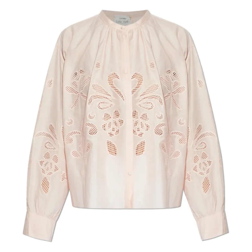 Forte Forte Openwork Top kombinerer delikat bomulds- og silkestof med indviklet botanisk openwork, hvilket giver en let, gennemsigtig bluse, der er ideel til forår og sommer. Den afslappede, boxy silhuet og de udstrakte ærmer med brede manchetter skaber et elegant og ubesværet look. Vigtige egenskaber: Pink | Bomuld og silke | Let | Åndbar | Knaplukning | Brede manchetter | Ingen synlige logoer eller inskriptioner | Botaniske openwork-motiver på front, ærmer og del af ryggen | Rund halsudskæring | Boxy silhuet | Let udstrakte ærmer med brede manchetter | Stofbetrukne knapper | Delvise rygdetaljer | Gennemsigtig effekt | Dimensioner & pasform: Modelhøjde: 177 cm | Buste: 83 cm | Talje: 61 cm | Hofter: 89 cm | Modellen er iført størrelse: I | Afslappet boxy pasform