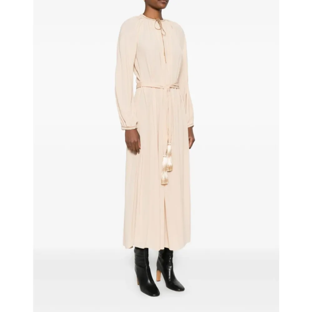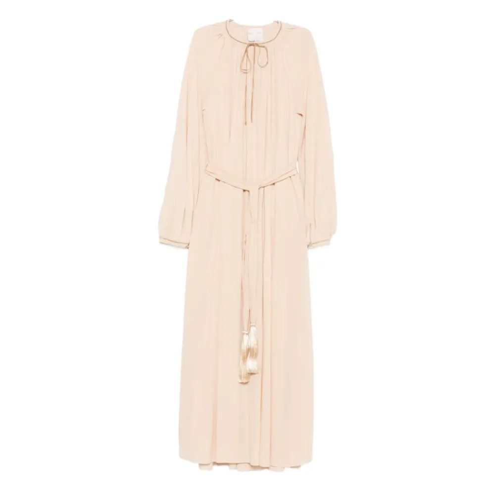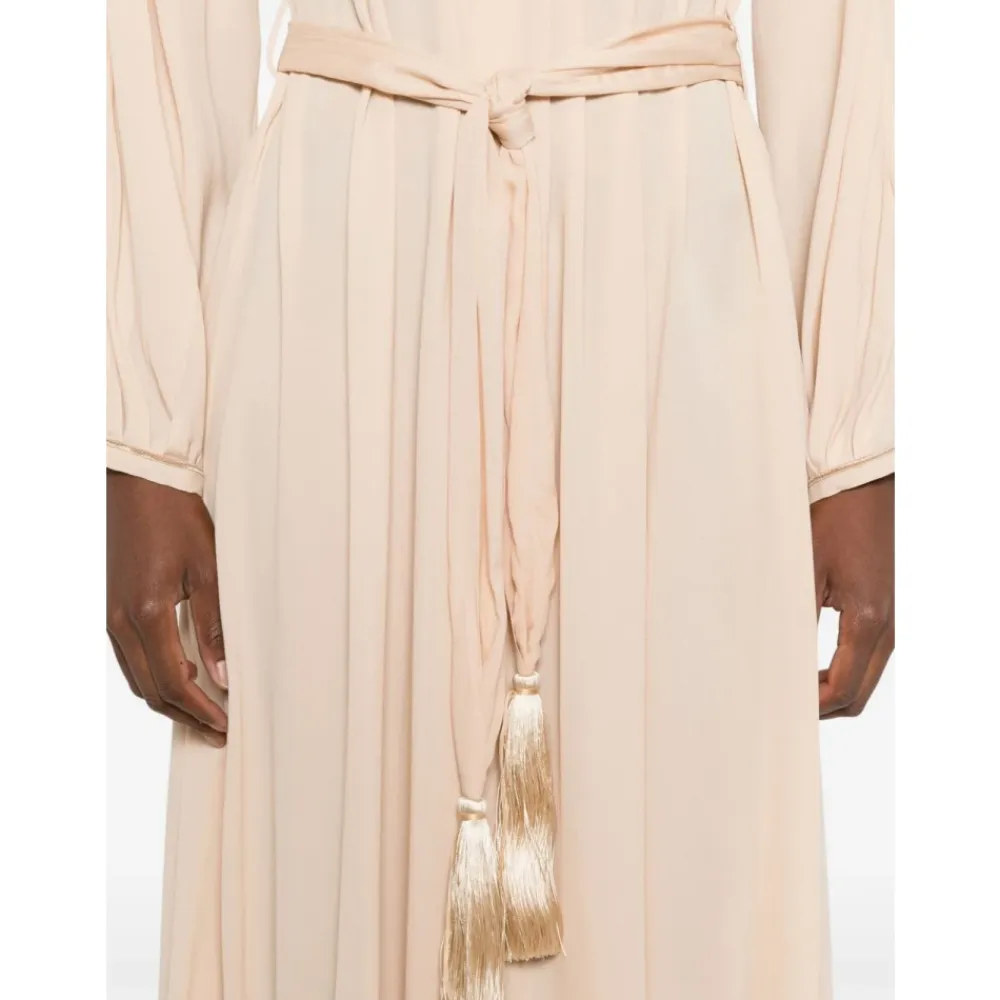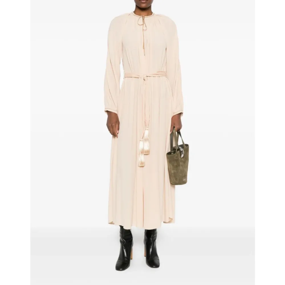 Forkæl dig selv med denne smukke Forte Forte maxi kjole i beige. Med en rund halsudskæring, snøring i halsen, lange ærmer og et bælte med kvastdetaljer. Denne kjole er tro mod størrelsen. Modellen er 1,75 m og bærer størrelse 1.
