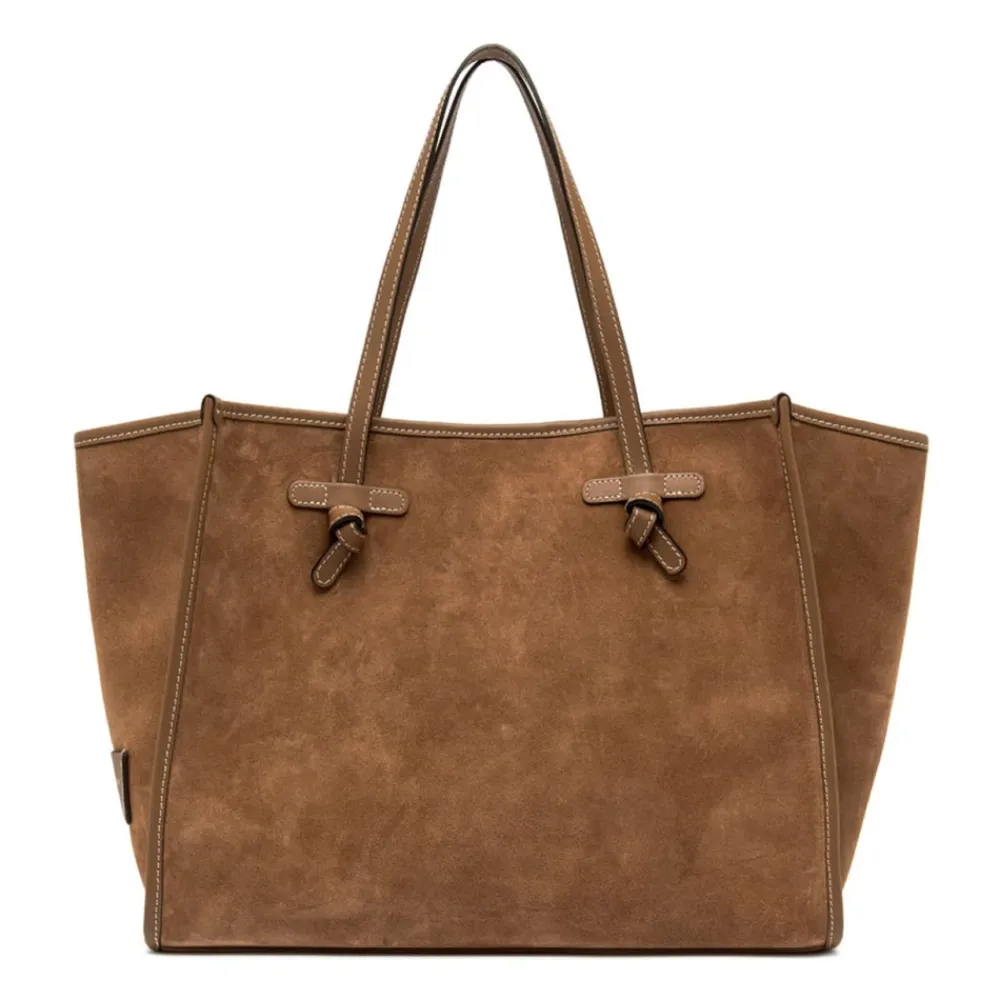 Gianni Chiarini Marcella Tote Bag er en ruskindstaske, der kombinerer en minimalistisk silhuet med praktiske detaljer til hverdagsbrug. Dens ruskindskrop, læderhanke og magnetlukning gør den til en elegant, men funktionel ledsager til daglige gøremål og arbejde. Vigtigste egenskaber: Brun | Ruskind | Magnetlukning | Læderhanke | Indvendig foring | Matchende aftagelig læderpung | Tone-i-tone trim | Minimalistisk silhuet | Rektangulær form | Dobbelte hanke | Dimensioner og pasform: 38x31x16 cm | One size | Sammensætning og pleje: 100% læder