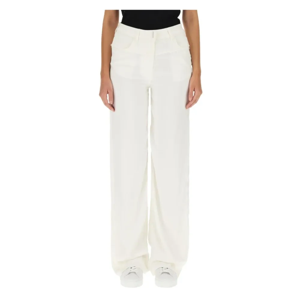 Givenchy Wide-Leg Bukser præsenterer en moderne silhuet med brede ben, der understreger et afslappet, elegant fald. Disse bukser passer til polerede, moderne outfits, hvor et rent snit foran og et flydende snit ønskes. Vigtigste egenskaber: Hvid | Wide-leg silhuet | Rent snit foran | Flydende snit | Dimensioner og pasform: Afslappet pasform
