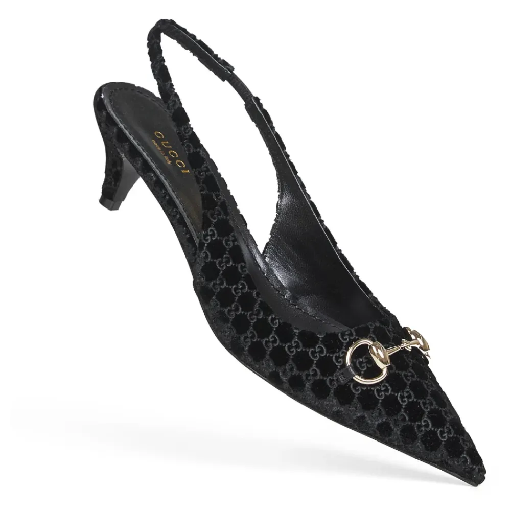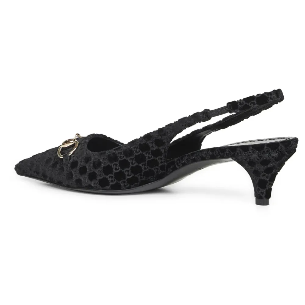 Gucci pumps i GG-velour med en spids tå og signatur Horsebit-detalje, designet til festlige lejligheder og aftenbrug. Vigtigste egenskaber: Sort | Velour | Ankelrem med elastisk indsats | Læderfor og -indersål | Lædersål | Spids tå | Lys guldfarvet metal Horsebit-detalje foran | GG-velouroverdel | Lav GG-velourdækket spolehæl | Mål og pasform: Hælhøjde: 45 mm | Sammensætning og pleje: 69% Viskose | 31% Cupro | Læder