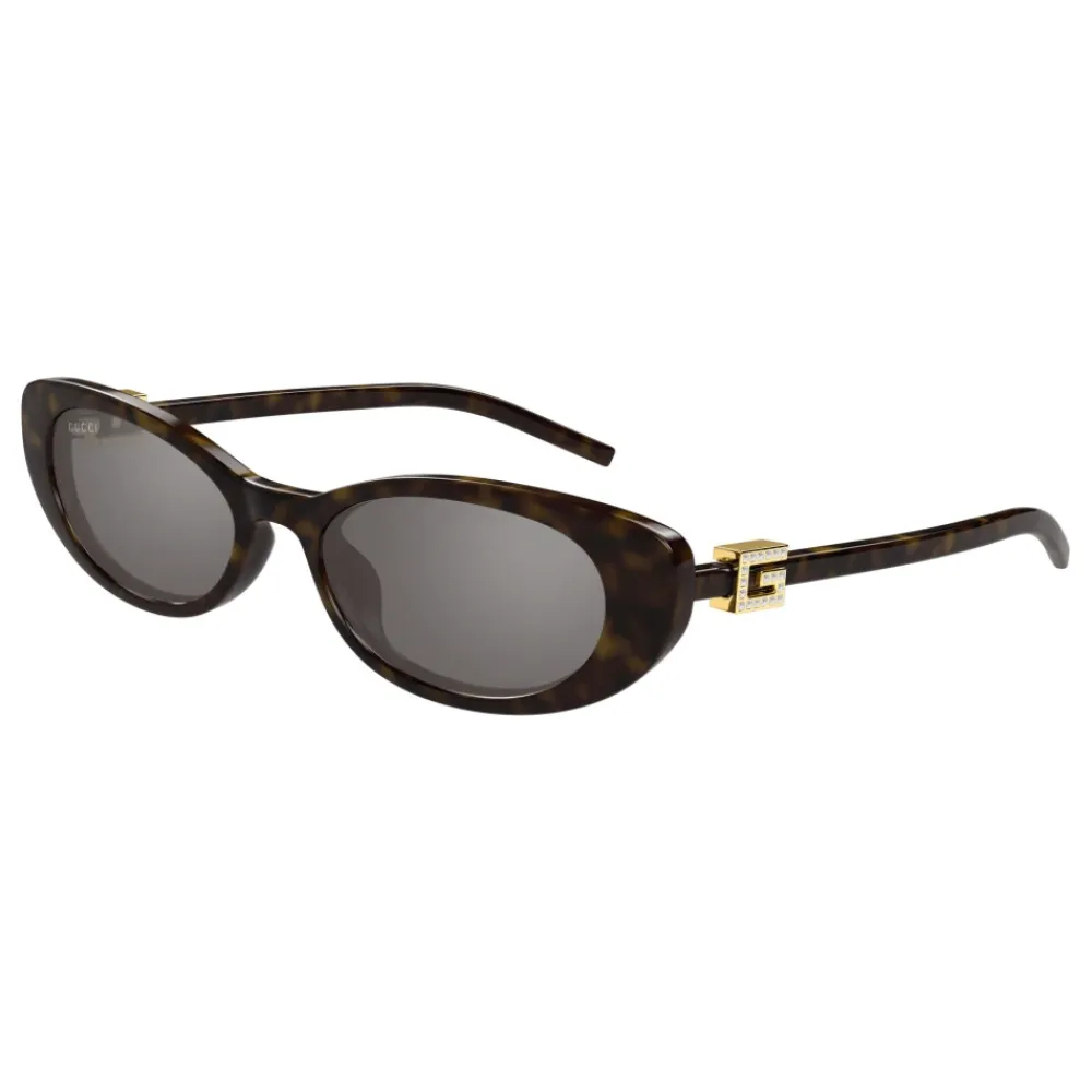 Gucci Cat-eye solbriller kombinerer en smal, 1990’er-inspireret oval cat-eye silhuet med tynde acetat-stel og grå glas. Stelene er accentueret med et guldfarvet metal ‘G’-logo besat med rhinsten for en karakteristisk poleret finish. Nøgleattributter: Brun | Havana | Grå | Acetat | Oval cat-eye form | Tynde stel | Guldfarvet metal ‘G’-logo med rhinstensudsmykning på stængerne | Dimensioner & pasform: Glasbredde: 52 mm | Næsebroens længde: 17 mm | Stanglængde: 140 mm | Sammensætning & pleje: Acetat