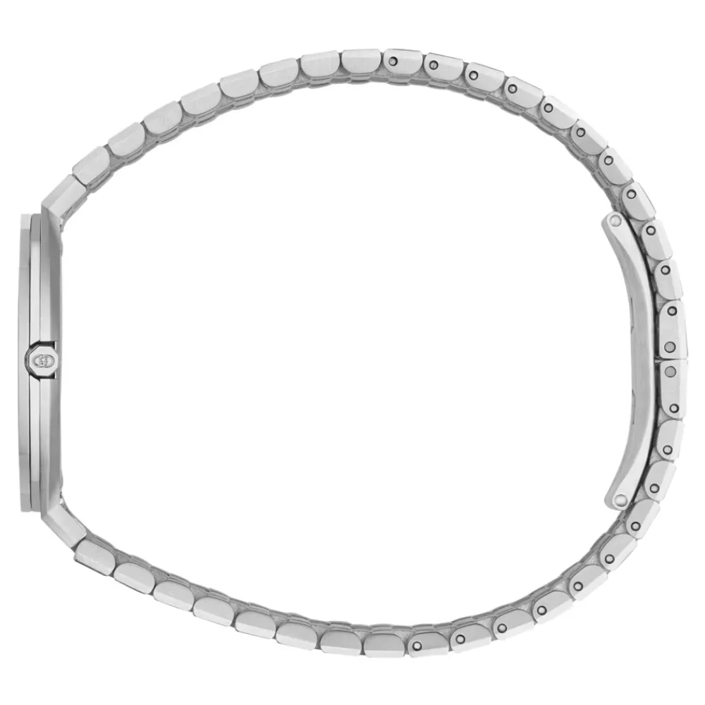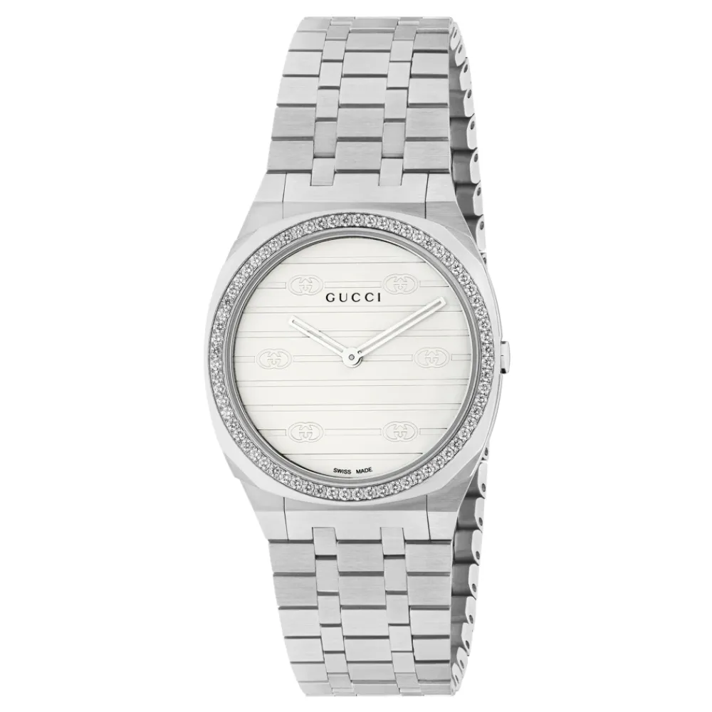 Løft din stil med Gucci 25H diamantbesat ur med rustfrit stållænke, der har et sofistikeret design med en diamantbesat urkrans og Interlocking G-motiv på en hvid messingurskive. Produkt detaljer: Sølv | Stål | Grå | Rustfrit stål | 3 ATM vandtæthed | 30 mm diameter | Safirkrystal | Stållås |