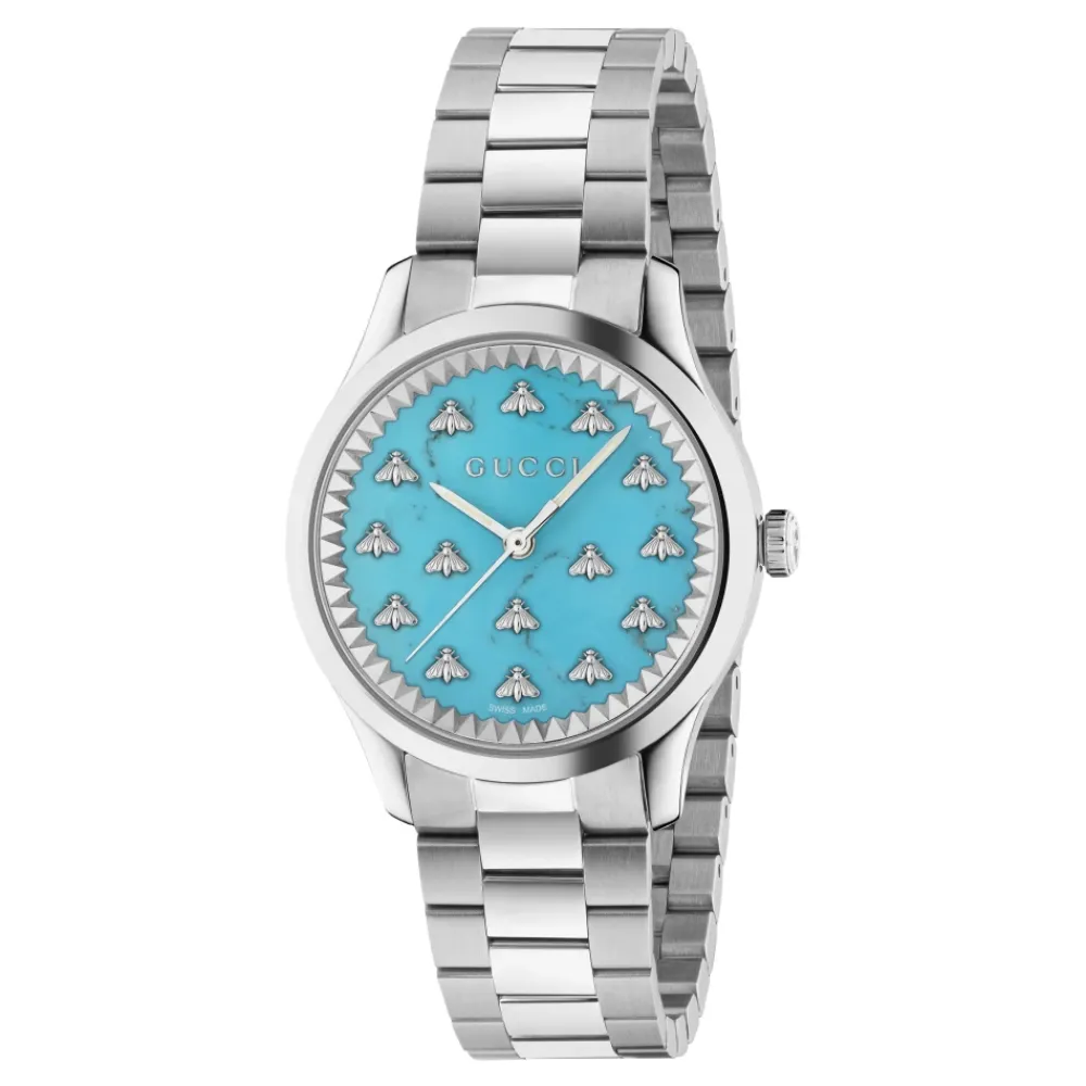Præsenterer Gucci Kvinders Turkis Skive Rustfrit Stål Ur. Dette fantastiske ur har et kvarts urværk og en 32 mm rustfri stålkasse. Med en vandtæthed på 5 ATM (164 fod/50 meter) er dette ur perfekt til daglig brug. Den turkise skive tilføjer et strejf af farve, mens safirglaset sikrer holdbarhed. Det rustfri stålarmbånd og lukning fuldender det elegante og stilfulde look. Hæv dit tilbehørsspil med dette Gucci ur.
