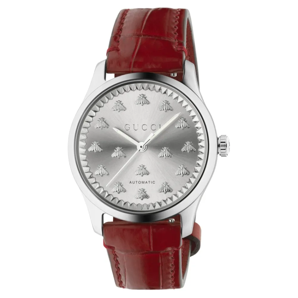 Præsenterer Gucci Kvinders Automatisk Ur med en smuk sølvskive. Uret er fremstillet med en rustfri stålkasse og har en diameter på 38 mm, hvilket gør det både elegant og holdbart. Med en vandtæthed på 5 ATM (164 fod/50 meter) og ridsefast safirglas er det perfekt til daglig brug. Det røde læderrem tilføjer et strejf af farve, mens lukningen i rustfrit stål sikrer en sikker pasform. Hæv din stil med dette eksklusive Gucci-tilbehør.
