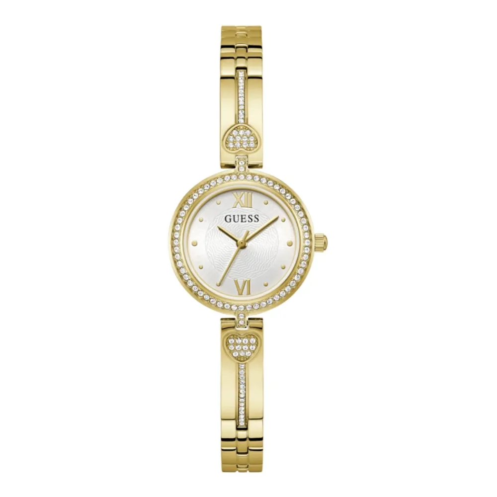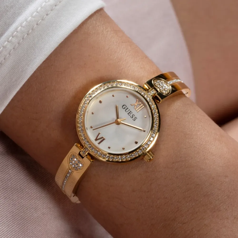 Guess Lovey Watch er et elegant, guldfarvet ur, der kombinerer et armbånd af rustfrit stål med krystalbesatte hjertedetaljer for et poleret hverdagslook. Nøgleattributter: Guld | Rustfrit stål | Vandafvisende til 30 meter | Quartz urværk | Mineral krystalglas | G-link spænde armbånd | Krystalbesat urkrans med hjertedetalje | Minimalistisk hvid urskive | To romerske tal som timemarkører | Dimensioner og pasform: Urkassens diameter 27 mm | Sammensætning og pleje: Rustfrit stål | Mineral krystal | Tør af med en blød klud. Undlad at trykke på knapperne, mens uret er vådt. Ikke egnet til svømning eller dykning.