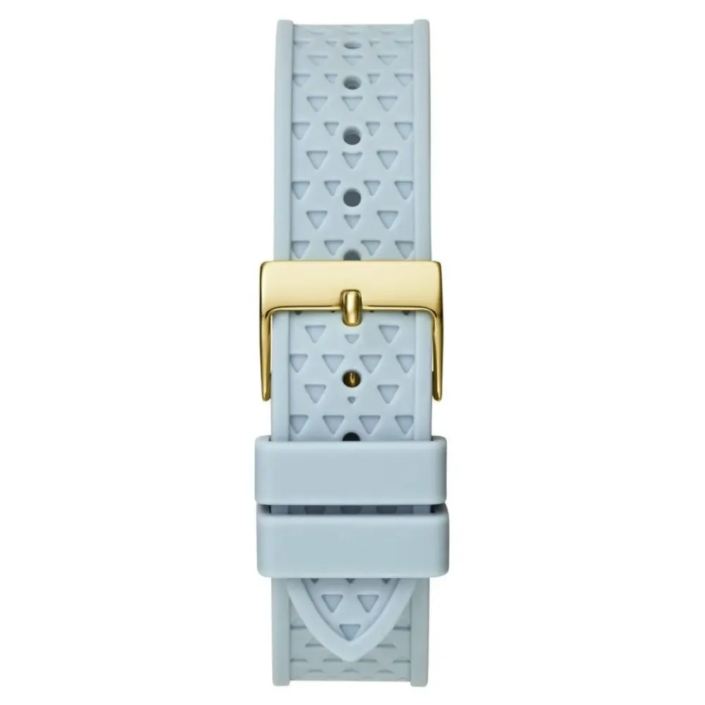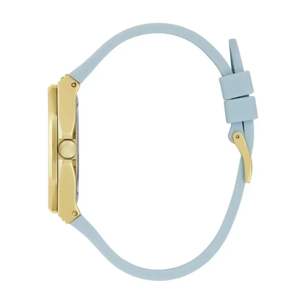 Guess Zest Multifunction Watch kombinerer et gyldent urkasse i rustfrit stål med en blå silikonerem, hvilket giver et markant, multifunktionelt hverdagsur. Nøgleattributter: Gylden | Blå | Rustfrit stål | Ikke vandafvisende | Quartz urværk | Analog visning | Multifunktion | Spænde lukning | Silikonerem | Krystalbesat urkrans | Ottekantet urkasseform | Blå urskive med subdials | Perforeret silikonerem | Dimensioner og pasform: Urkassediameter: 39 mm | Sammensætning og pleje: Rustfrit stål | Silikone | Mineralglas