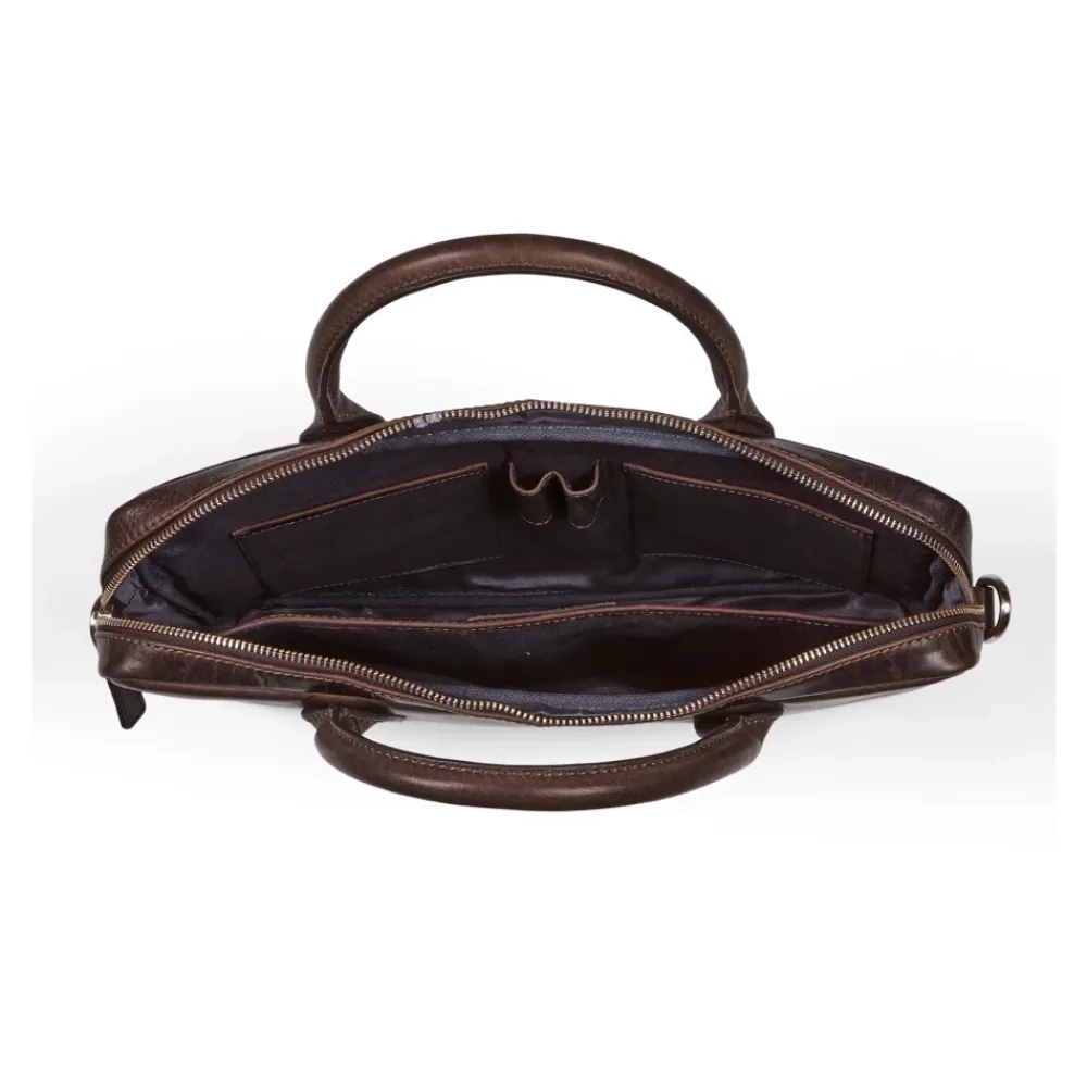 Howard London Laptop Taske Evan er en kompakt læder laptop taske designet til daglig transport og forretningsbrug, med et polstret laptoprum og et organiseret interiør til essentielle ting. Vigtige egenskaber: Mørkebrun | Koskindslæder | Justerbar og aftagelig skulderrem | Polstret rum til laptop | Slip-in lomme | Ekstern lynlåslomme | YKK lynlåse | Premium hardware | Organiseret interiør | Kompakt silhuet | Dimensioner & pasform: Længde: 36 cm | Bredde: 25 cm | Dybde: 5 cm | Sammensætning & pleje: Koskindslæder