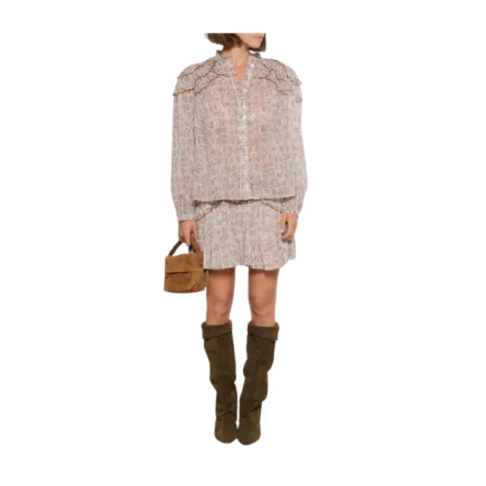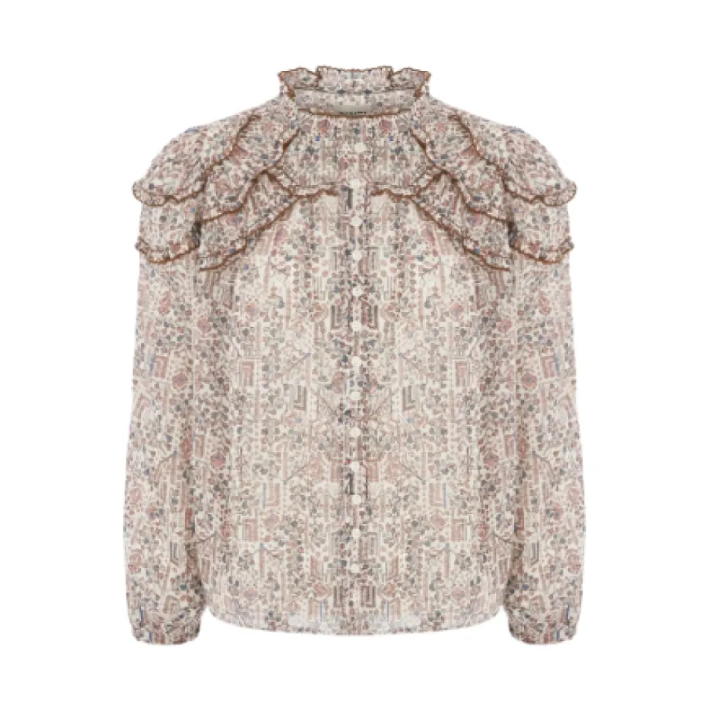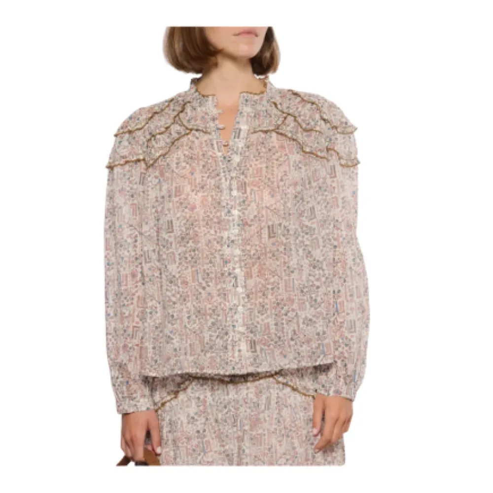 Isabel Marant Bluse légère tilfører et boheme-præg med flæser på skuldrene og en høj, rynket krave, afsluttet i et delikat blomsterprint for en romantisk hverdagsstil. Nøgleattributter: Beige | Ecru | Letvægtsstof | Flæser på skuldrene | Høj, rynket krave | Delikat blomsterprint