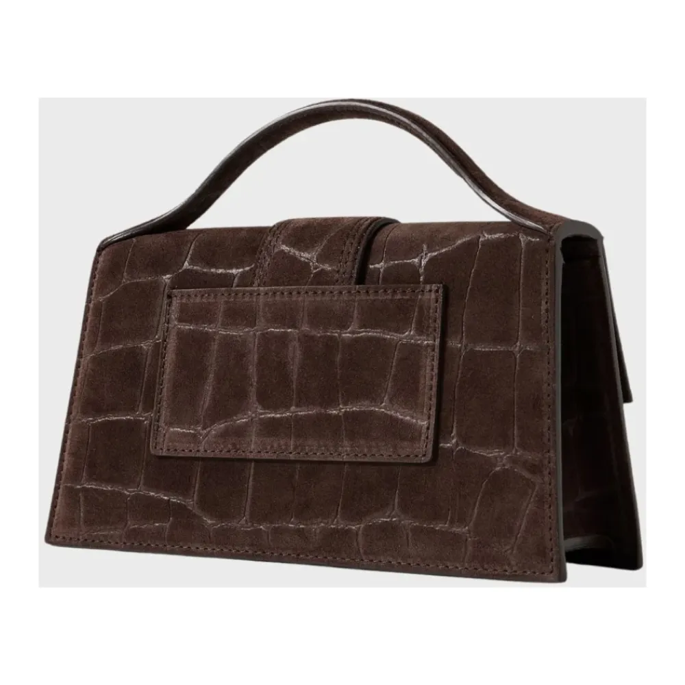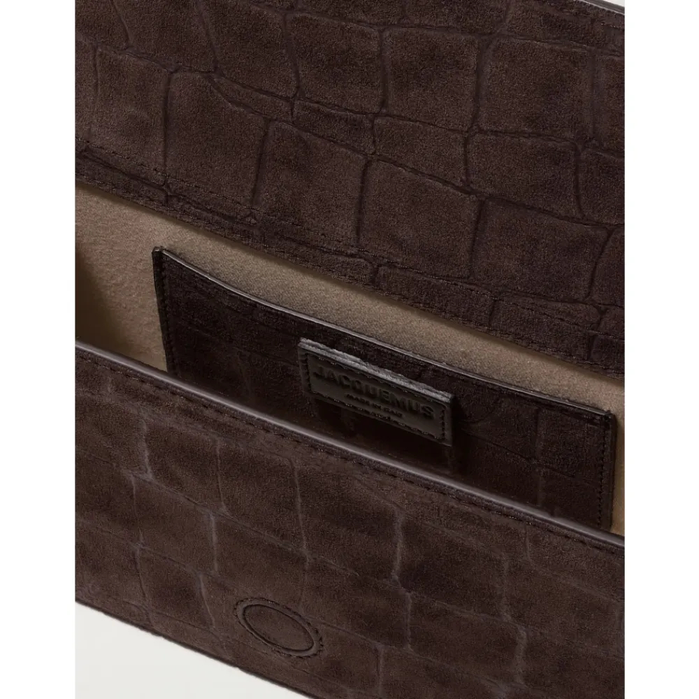 Jacquemus Le grand Bambino er en kompakt, struktureret crossbody taske med ruskind med krokodilleeffekt og et polstret tophåndtag. Den kombinerer en magnetisk klap og aftagelig rem for alsidig hverdagsbrug. Vigtige egenskaber: Brun | Marrone | Ruskindslæder | Polstret tophåndtag | Magnetisk klaplukning | Lang, aftagelig og justerbar skulderrem | Graverede metalkarabinhagelukninger | Indvendig læderlomme | Udvendig baglomme | Fuldt foret i bomuld | Struktureret silhuet | Krokodilleeffekt-prægning | Topstitched detaljer | Guld metal logo og hardware | Farvede kanter | Dimensioner & pasform: 23,5 cm x 13 cm x 7 cm | Sammensætning & pleje: Præget ruskindslæder | Foring: 100% bomuld | Metalhardware | Undgå direkte udsættelse for lys, kosmetik, vand og varme. Opbevar i støvposen på et tørt sted, og rengør med en blød, tør klud.