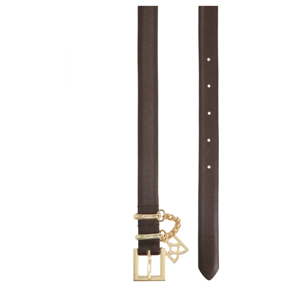 Brunt bælte lavet af høj kvalitet naturlæder er et stilfuldt og sofistikeret tilbehør med et subtilt præg af karakter. Den slanke pasform giver den en let og alsidig charme, perfekt til både elegante og hverdagslige outfits. Udsmykket med to metalringe, der er forbundet af en delikat kæde med et guld KAZAR monogram, får bæltet et smykkepræg og et luksuriøst udseende. De gyldne detaljer blander sig smukt med den dybe brune nuance og tilføjer en raffineret finish.