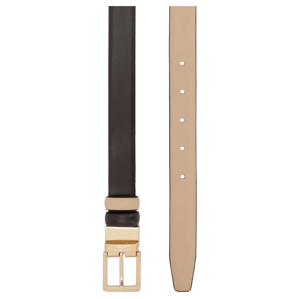 Kazar Perkins Bælte er et dobbeltsidet kernelæderbælte, der giver to looks i ét. Et guldfarvet roterende spænde med et indgraveret KAZAR-logo giver dig mulighed for hurtigt at skifte side, hvilket gør det velegnet til både skræddersyede bukser og elegante kjoler. Vigtige egenskaber: Brun | Mørkebrun | Kernelæder | Vendbart (dobbeltsidet) | Justerbar længde | Fem huller | Guldfarvet roterende drejespænde med indgraveret KAZAR-logo | Præcist afsluttede kanter | Subtile kontrasterende bæltestropper | Dimensioner & pasform: Bredde: 2,5 cm | Justerbar længde | Fem huller | Kan afkortes ved spændet | Sammensætning & pleje: Kernelæder | Metalspænde