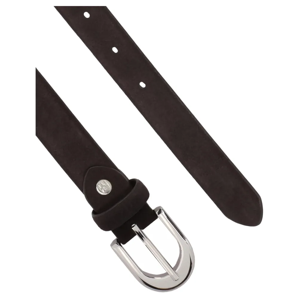 Det præsenterede bælte er et stilfuldt tilbehør med en subtilt feminin karakter, lavet af høj kvalitet naturligt ruskind i en dyb, mørkebrun nuance. Den bløde, matte tekstur af materialet giver det et elegant og let afslappet udseende, som vil supplere både hverdags- og mere forfinet styling perfekt. Opmærksomheden rettes mod den afrundede sølvspænde med en blank finish, som introducerer et element af sofistikering og er en delikat smykkeaccent. Det subtile prægede KAZAR-logo på bæltets løkke understreger bæltets brandkarakter. Den slanke form gør det til et perfekt match til bukser med smalle løkker, kjoler eller nederdele, og dets universelle design gør det til et tidløst tilføjelse til dit skab.