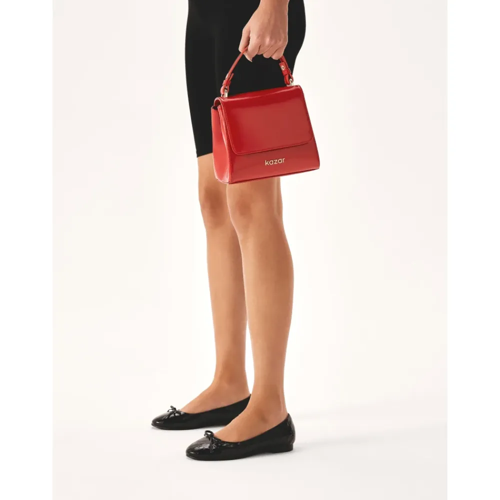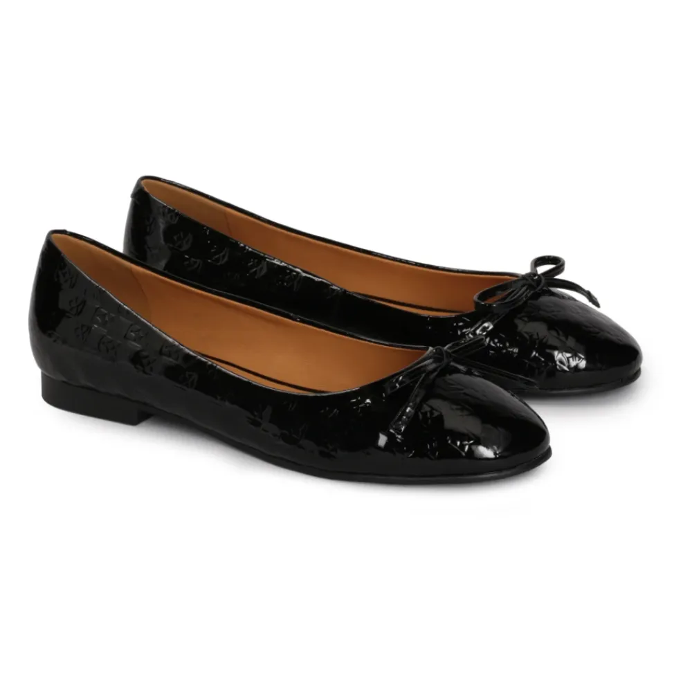 Ballerinaerne lavet af høj kvalitet præget patentlæder ser stilfulde, fashionable og ekstremt charmerende ud. Den minimalistiske overdel med regelmæssigt arrangerede prægede KAZAR-monogrammer er dekoreret med en læderbue, som ser ekstremt feminin ud. Behagelige flade ballerinaer er det perfekte valg for damer, der lægger lige stor vægt på komfort og æstetisk udseende. Ballerinaer i skinnende sort farve øger praktikabiliteten af dette model. Foret lavet af semianilin-fårskind, takket være dets fremragende fugtabsorberende egenskaber, giver enestående komfort. Tunisk lædersål garanterer holdbarhed, styrke og æstetisk udseende af skoene.