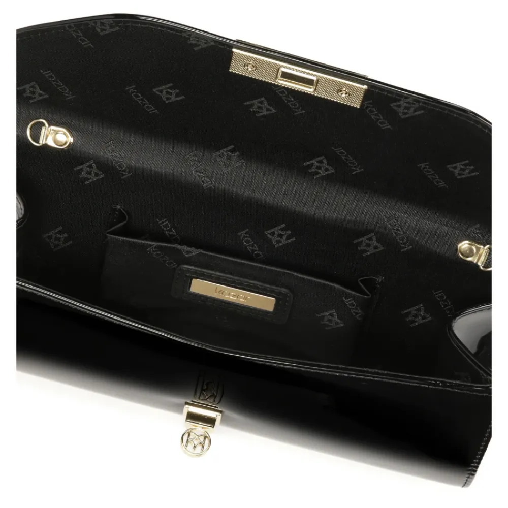 En elegant sort clutch taske med en aflang, strømlinet form er et smart tilbehør lavet af laklæder. Dens blanke overflade tilføjer dybde og luksuriøs appel, hvilket gør det til det perfekte valg til aftenbegivenheder og formelle lejligheder. Håndtasken opretholder en slank, minimalistisk silhuet, der understreger dens tidløse karakter. Lukklappen har en twistlås i form af KAZAR-monogrammet – en subtil, men iøjnefaldende detalje, der tilføjer klasse og unikhed. Indersiden af clutch tasken, omhyggeligt færdiggjort, tilbyder tilstrækkelig plads til essentielle genstande som telefon, nøgler eller små kosmetik. Den sorte farve, kombineret med den lakerede finish, gør tasken ekstremt alsidig og passer perfekt til både aften- og elegant styling. Dette tilbehør er kvintessensen af klasse og moderne design, perfekt til kvinder, der værdsætter tidløs elegance. Produkt detaljer: Hovedrum lukket med en klap med twistlukning. Indvendigt 1 åbent lomme.