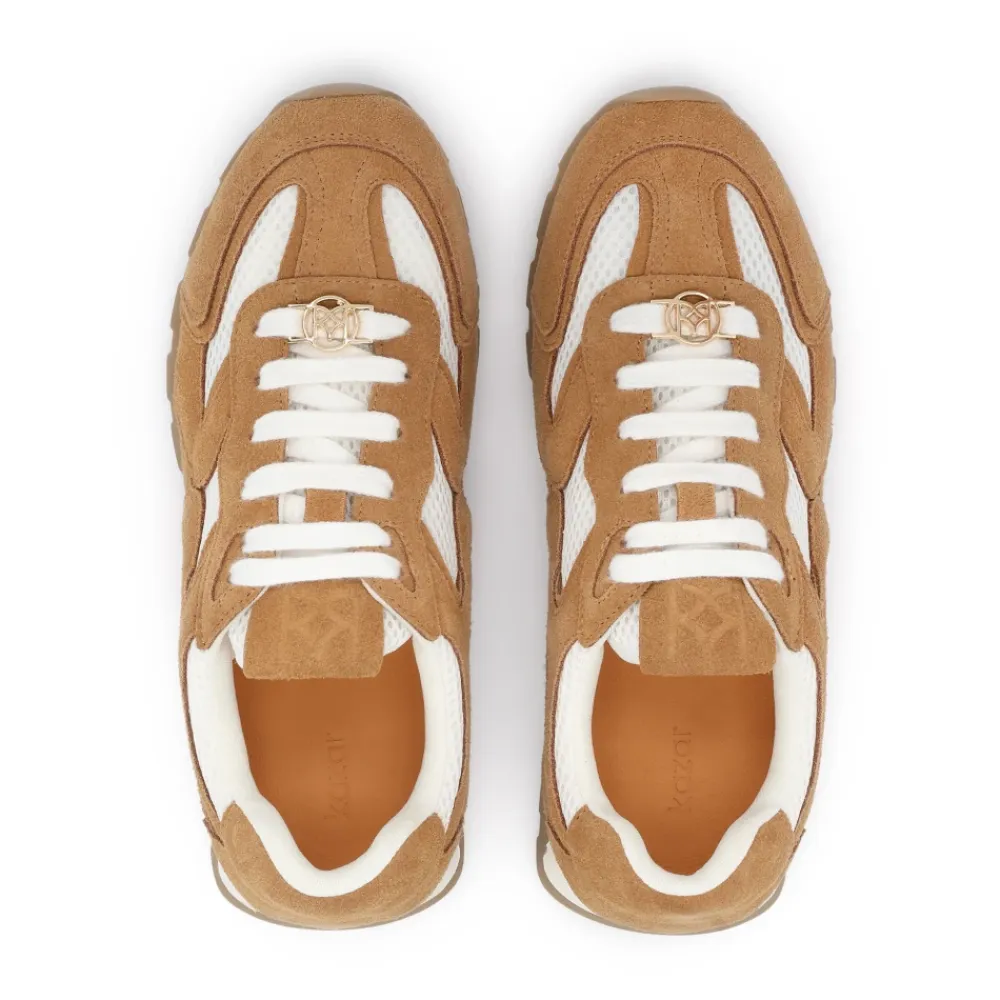 Kazar FARA sneakers kombinerer blødt brunt ruskind med luftigt hvidt stof for en let og åndbar sko, der er fremhævet af guldfarvede monogramsnørebånd. Designet til hverdagsbrug i byen, kombinerer de en sporty karakter med raffinerede detaljer. Vigtige egenskaber: Brun | Ruskind og stof | Åndbar | Let | Snørelukning | Fleksibel rillet sål | For i fårelæder | Guldmonogram på snørebånd | Dynamiske syninger | Flerlags overdel | Meshpaneler | Sammensætning & pleje: Ruskind | Stof | Fårelæder (for) | Syntetisk sål