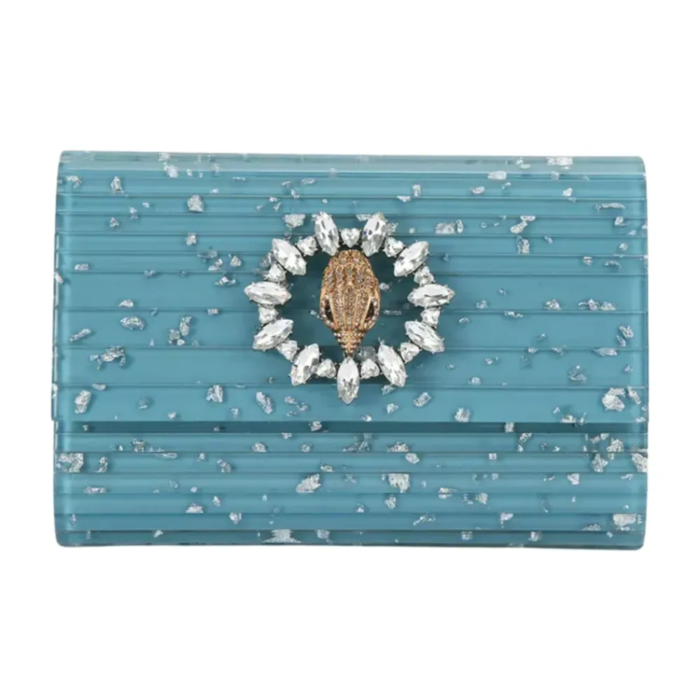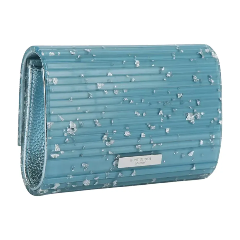 Kurt Geiger Party Eagle Clutch er en iøjnefaldende perspex clutch designet til festlige lejligheder, med et pyntet ørnehoved som en markant finish. Nøgleattributter: Blå | Mellemblå syntet | Paneler i perspex | Valgfri kæderem | Lille indvendig lomme | Kan rumme telefoner op til 17,8 cm | Ørnehoved-dekoration med krystal- og perledetaljer | Paneler i perspex med marmor-/glittereffekt | Monogramforet inderside | KGL-branding på bagsiden | Mål og pasform: 12 cm (H) x 19 cm (L) x 4 cm (D) | Remfald: 117 cm | Passer til telefoner op til 17,8 cm | Sammensætning og pleje: Paneler i perspex (ydre) | Monogramforet inderside