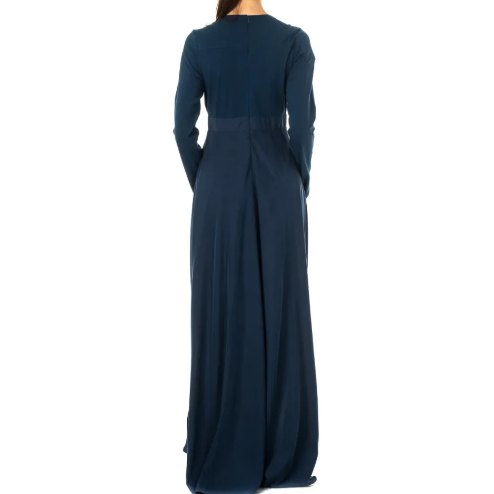 Denne elegante, langærmede marineblå kjole er perfekt til enhver anledning og passer lige så godt til hverdag som til fest. Produkt detaljer: Marineblå | Modal | Polyester | Spandex | Lynlåslukning i ryggen | Lange ærmer | V-udskæring | Metal logo plade | Dimensioner og pasform: Regular fit | Sammensætning og pleje: 67% Modal | 25% Polyester | 5% Spandex | Vaskes ved kold temperatur, tørretumbles ved lav temperatur