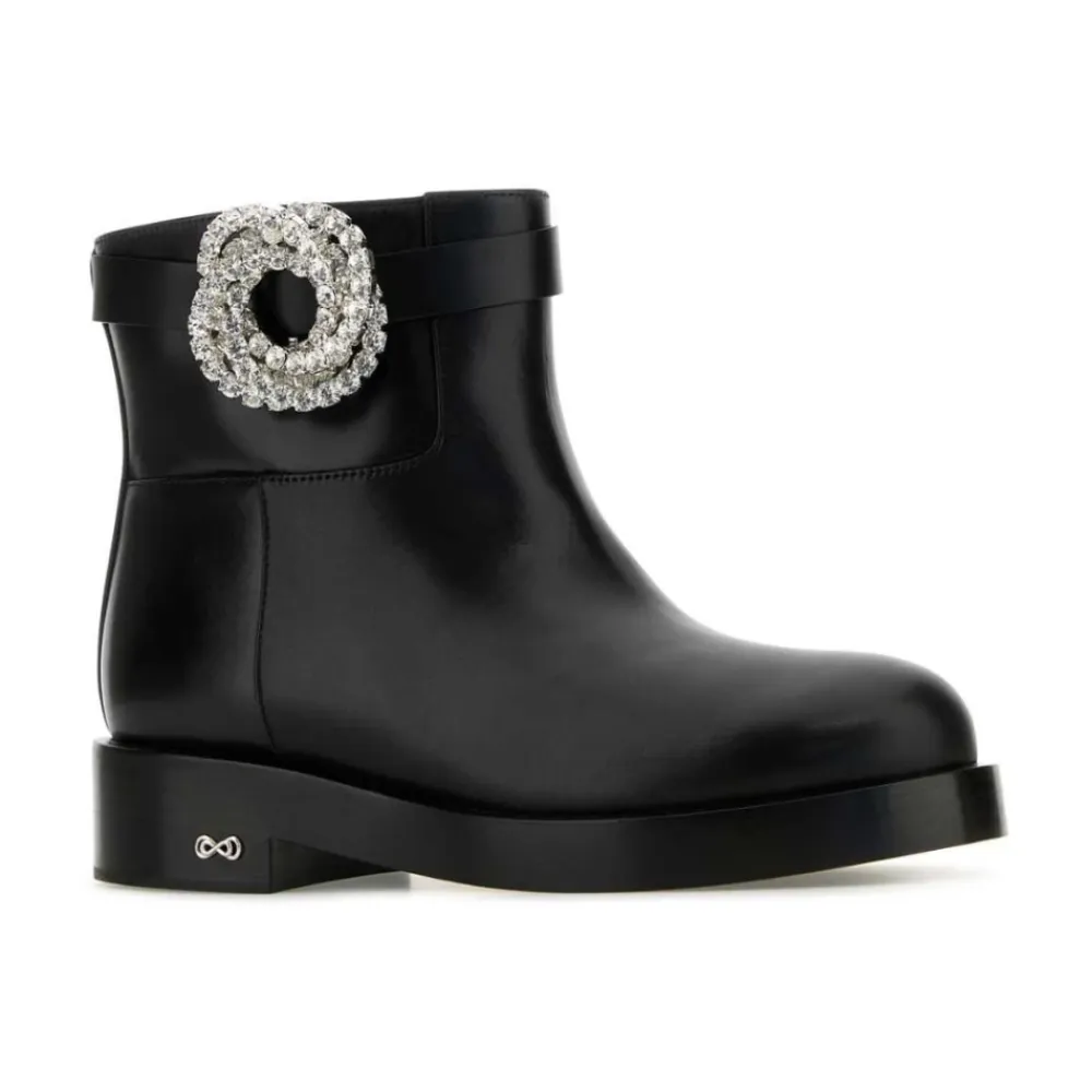 Mach & Mach Galaxy Ankelstøvler kombinerer en struktureret ankel-silhuet med et krystalbesat spænde for et elegant look, der passer til både dag og aften. Vigtige egenskaber: Sort | Kalveskind | Ankelrem | Krystalbesat spænde | Blok hæl | Rund snude | Ankel-længde silhuet | Glat finish | Dimensioner & pasform: Hælhøjde: 40 mm | Sidder tæt omkring anklen | Sammensætning & pleje: Ydre: 100% Læder | For: 100% Læder | Sål: 100% Læder