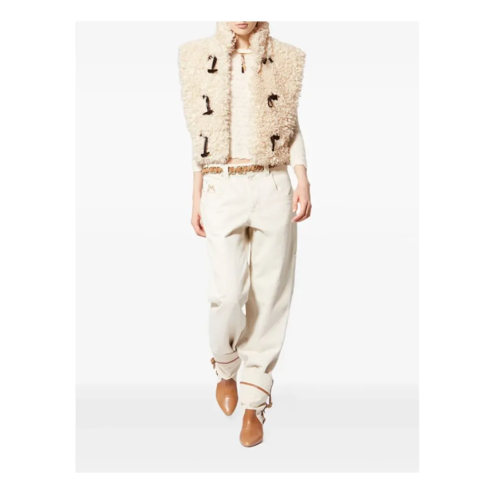 Marant étoile Alisa Vest er en bouclé faux-fur ærmeløs vest designet til lag-på-lag styling. Den skiller sig ud med sin teksturerede bouclé finish og kontrastfarvede toggle-lukninger, ideel til at tilføje varme og tekstur til outfits. Vigtigste egenskaber: Beige | Polyester | Sidelommer med slids | Toggle-lukninger | Bouclé faux-fur tekstur | Nedfældelig stand-up krave | Brede skuldre | Lige snit | Kontrasterende toggle-lukninger | Dimensioner & pasform: Lige snit | Materiale & pleje: 100% polyester | Kun kemisk rensning.