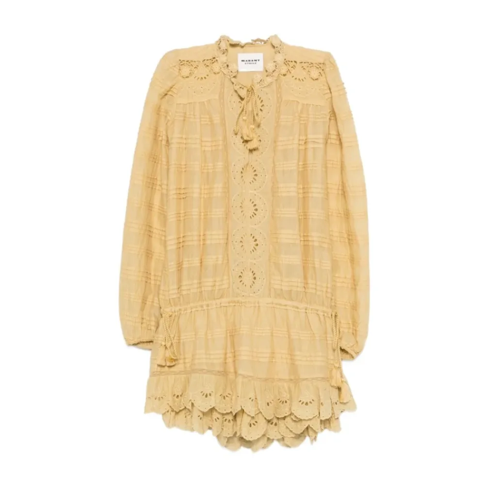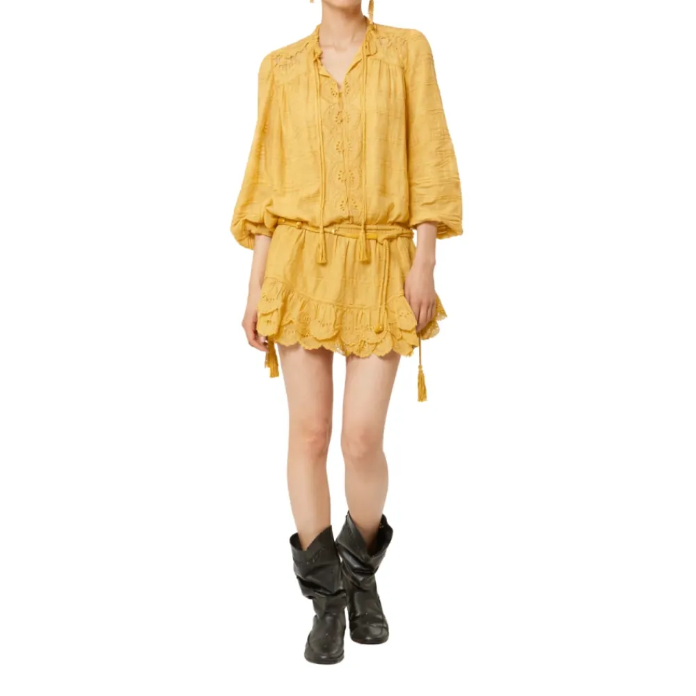 Marant étoile Preya Dress er en kort, flæsebesat hverdagskjole, der kombinerer broderede blonde detaljer med en snøre i taljen for et let, feminint hverdagslook. Ideel til afslappede udflugter og weekendbrug. Nøgleattributter: Gul | Lys okker | Bomuld | Bindebånd i halsen | Elastiske manchetter | Elastisk talje med snøre | Lukning foran i halsen | Tunisisk bindebånd i halsen med pompon snore | Lange ærmer med elastiske manchetter | Flæsebesat skørt med læg | Blomsterbroderi og blonde detaljer | Bølgekant | Flared snit | Dimensioner & pasform: Løs pasform | Normal i størrelsen | Elastisk talje for justerbar formning | Flared kort silhuet | Sammensætning & pleje: 100% bomuld | Maskinvask på et skåneprogram, vrangen ud, maks. 30°C.