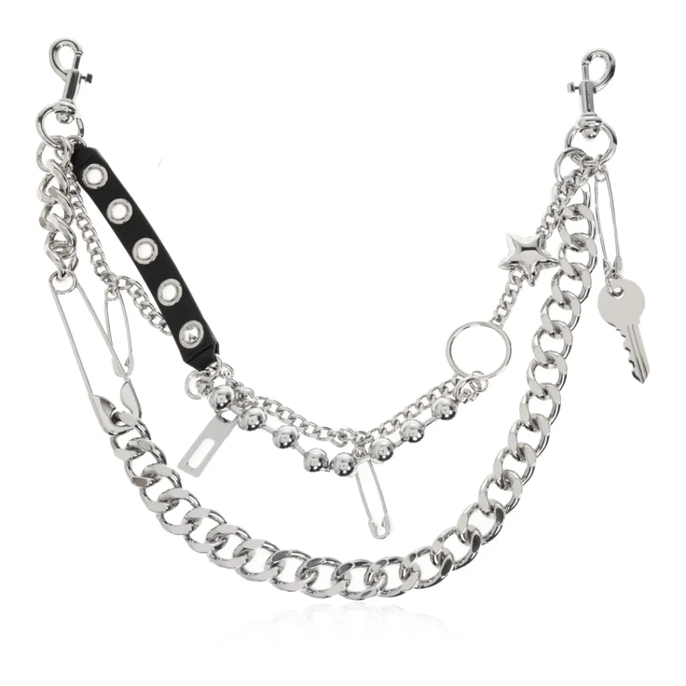 Marc Jacobs Taske Kæde er et markant taskeaccessorie defineret af et flerlaget sølvfarvet kædevæv og iøjnefaldende hardware. Den opdaterer enhver taske med industrielt inspirerede detaljer og en sort rem med nitter for et hverdagsagtigt look. Vigtige egenskaber: Grå | Sølvfarvet | Metal | Holdbar konstruktion | Komfortabel rem | Flerlaget kæderem | Sort rem med nitter | Fastgørelsesringe til styling | Kædevæv med flere teksturer | Sikkerhedsnåle og ringhardware | Nøgle- og stjernevedhæng | Industrielt sølvfinish | Nittedetaljer på rem | Sammensætning & pleje: Zink | Jern | Messing | Aluminium | Polyester | Polyurethan | Syntetisk læder eller syntetisk materiale
