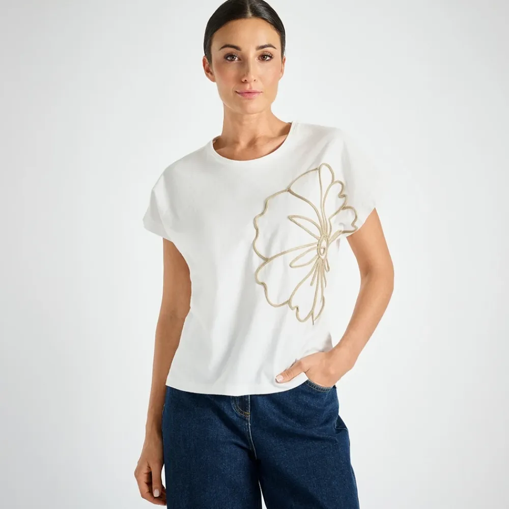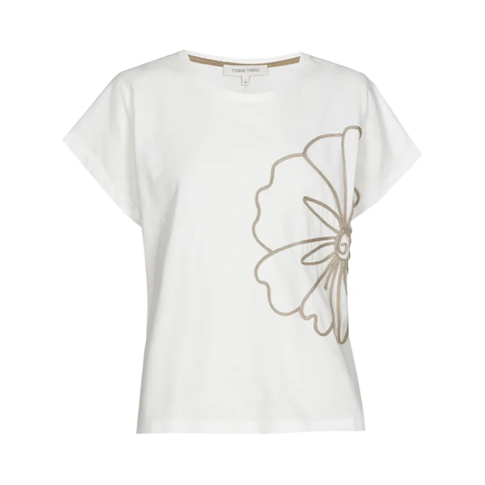 Marie Méro TS62 T-Shirt er en enkel, elegant T-shirt, der defineres af en beige broderet blomst på siden. Fremstillet i sprød bomuld, den fungerer alene eller lagvis for et smart sommerlook. Vigtige egenskaber: Hvid | Beige | Bomuld | Blød følelse | Sprød tekstur | Rund hals | Kort ærme | Beige broderet blomst på siden