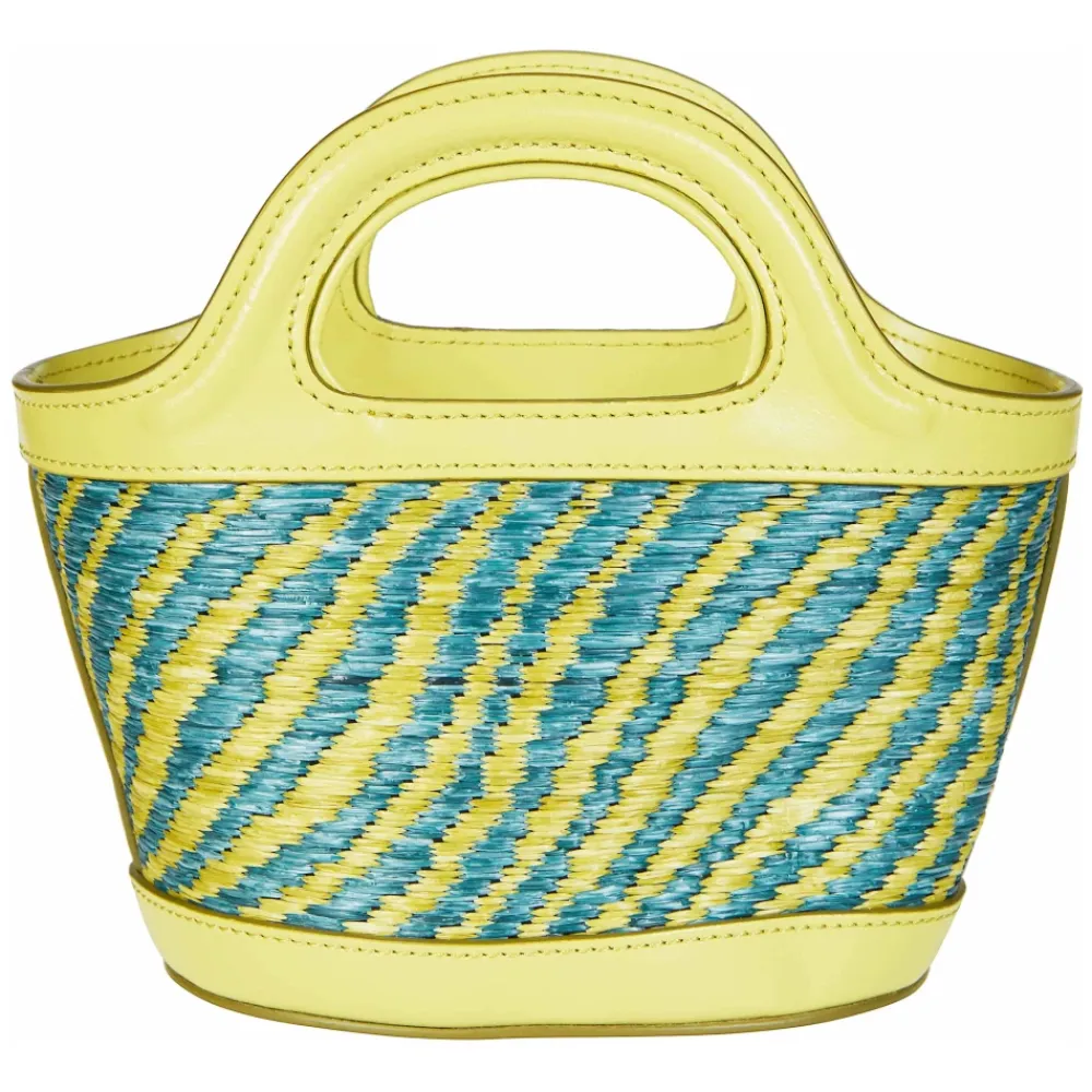 Marni Tropicalia Micro er en kompakt mini-taske med raffia-effekt, der har et tofarvet bølgemønster og broderet logo. Dens tophanke og aftagelige skulderrem gør den ideel til håndfri brug om aftenen eller dagen. Nøgleattributter: Multicolor | Verde | Polyamid | Tophanke | Aftagelig skulderrem | Læderrem lukning med metal knap | Tofarvet bølgemønster | Raffia-effekt stof | Broderet logo | Kontrast læderkant | Sammensætning & pleje: Krop: 83% Polyamid, 17% Polyester | Kontrast: 100% Kalvelæder | Foring: 95% Bomuld, 5% Akryl | Metaldele: 100% Messing | Metaldele: 100% Zama | Undgå at udsætte læderet for ru overflader. Hvis det udsættes for regn, tørres det straks med en blød klud. Rengør med en blød, tør klud; undgå alkoholbaserede produkter, cremer eller rengøringsmidler.