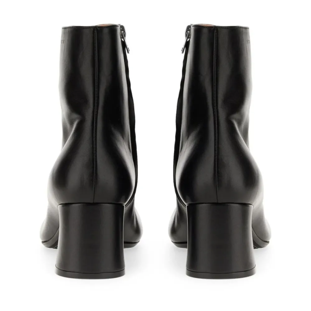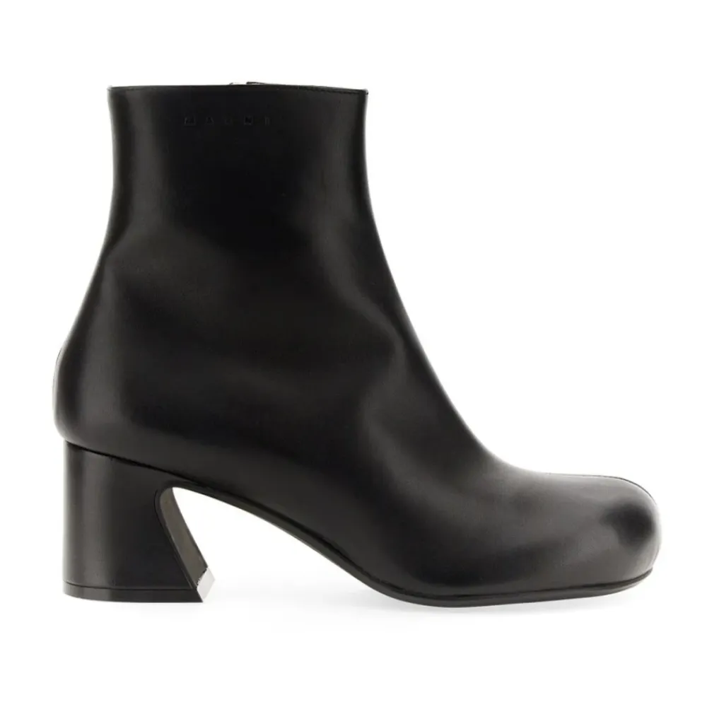 Marni Støvletter med blokhæl kombinerer en skulpturel blokhæl med en glat læderoverdel for en moderne silhuet, der kan bruges fra dag til aften. Designet balancerer statement-stil med nem brug takket være en diskret lynlåslukning. Vigtigste egenskaber: Sort | Læder | Lynlåslukning i siden | Gummisål | Blokhæl | Mandelformet tå | Glat læderfinish | Mål og pasform: Hælhøjde: 6,5 cm | Passer normalt i størrelsen | Sammensætning og pleje: Overdel: 100% Læder | Sål: Gummi