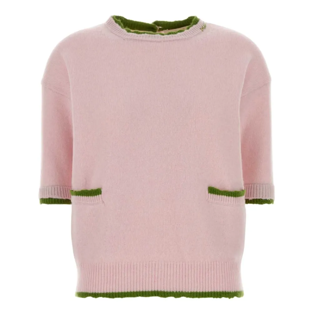 Marni rundhalset sweater i uld og cashmere, fremstillet af en blød jomfruuld-cashmere blanding. Designet til let varme og alsidig hverdagsstyling. Vigtige egenskaber: Pink | Jomfruuld | Let strik | Varm | Knaplukning bagpå | Rund halsudskæring | Trekvartærmer | Ribstrikket kant og manchetter | Broderet logo | Kontrasterende kanter | Sammensætning og pleje: 90% jomfruuld | 10% cashmere