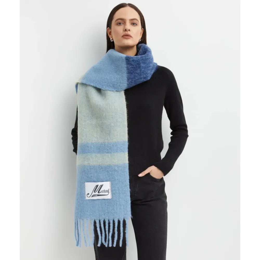 Hold dig varm og stilfuld med dette Marni vintersjal til kvinder. Med blå striber med frynsede ender og et stort Marni-logo. Lavet i Italien af en blanding af mohair, polyamid, uld og alpaka uld.