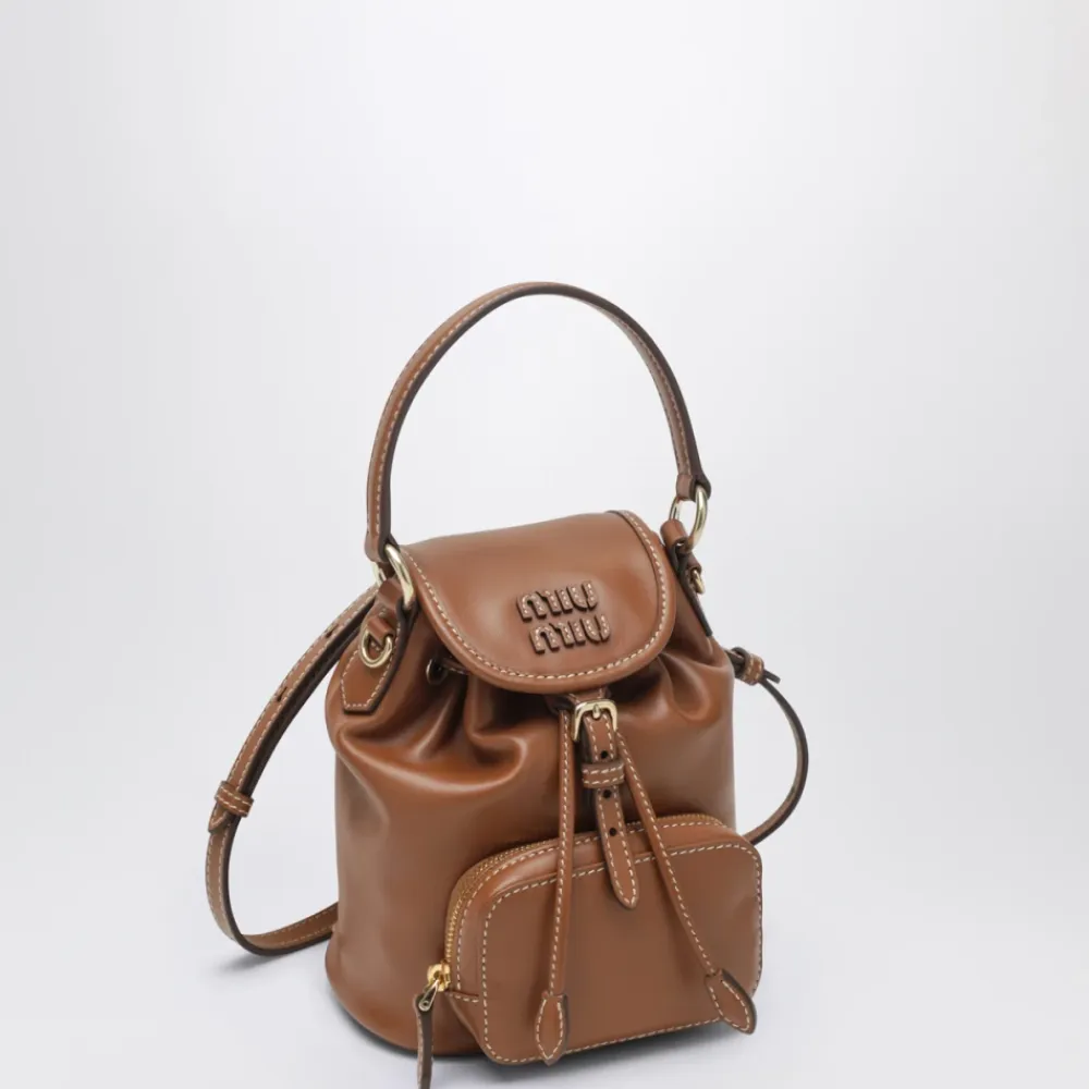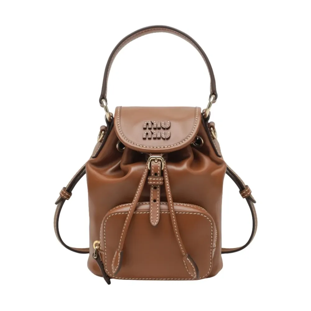 Miu Miu Læder Mini Rygsæk er en kompakt kalveskindsrygsæk designet til håndfri daglig brug, med en klapspænde og justerbare stropper for sikker transport. Nøgleattributter: Brun | Brandy | Læder | Justerbare skulderstropper | Top håndtag | Lynlåslomme foran | Klap med spændelukning | Aftagelig skulderstrop | Logo bogstaver på klap | Guldfarvet hardware | Kompakt silhuet | Dimensioner & pasform: One size | Sammensætning & pleje: Kalveskind: 100%