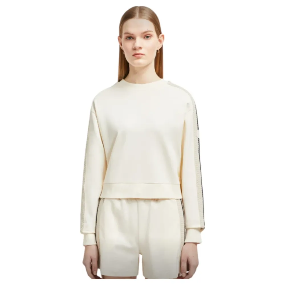 Moncler Stribet Hæklet Sweatshirt Sæt tilbyder et elegant twist på afslappet tøj med sine fine hæklede detaljer. Perfekt til et sommerligt ensemble, dette sæt kombinerer komfort og stil ubesværet. Produkt detaljer: Lys Beige | Beige | Bomuldsfleece | Crew Neck | Hæklet Kant Langs Ærmer | Dimensioner og pasform: Oversized Pasform | Sammensætning og pleje: 100% Bomuld | Maskinvask kold, tørretumbles ved lav varme.