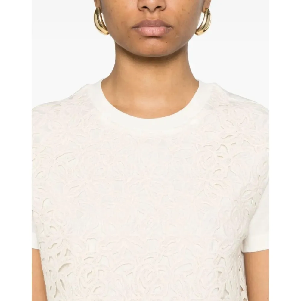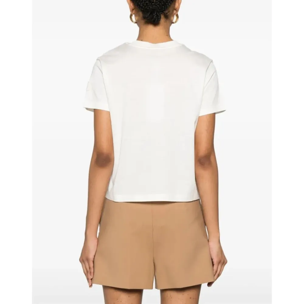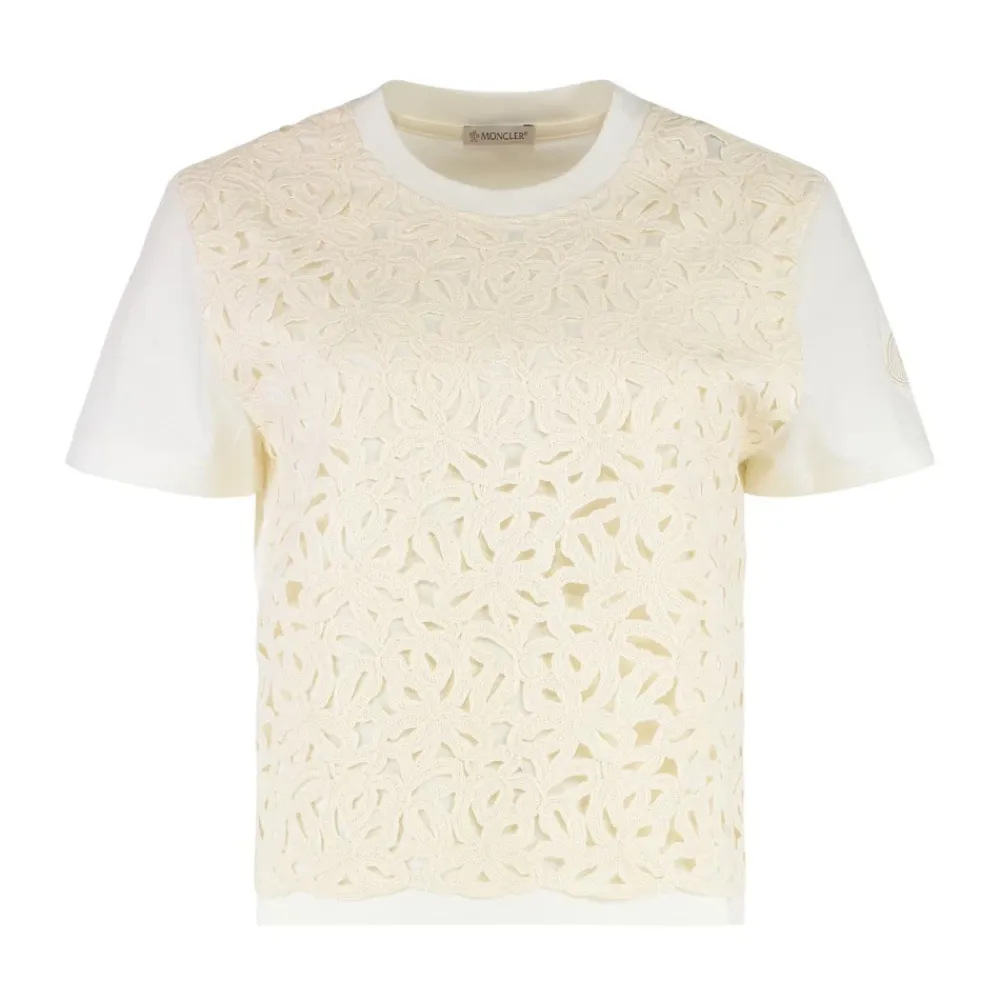 Moncler Lace T-Shirt opdaterer en klassisk T-shirt med rund hals med en delikat blondeoverdel på forsiden, der kombinerer afslappet komfort med raffinerede detaljer til hverdagsbrug. Nøgleattributter: Beige | Elfenben | Bomuld | Rund hals | Korte ærmer | Blondeoverdel på forsiden | Klassisk T-shirt silhuet | Dimensioner og pasform: Almindelig pasform | Sammensætning og pleje: Basismateriale: 100% bomuld | Ribkanter: 100% bomuld | Broderi: 70% bomuld, 30% polyamid/nylon | Maskinvask ved maks. 30°C (skånsom proces). Må ikke bleges. Må ikke tørretumbles. Stryg ved maks. 110°C uden damp. Må ikke renses. Professionel vådrens (skånsom). Tørres fladt i skyggen.