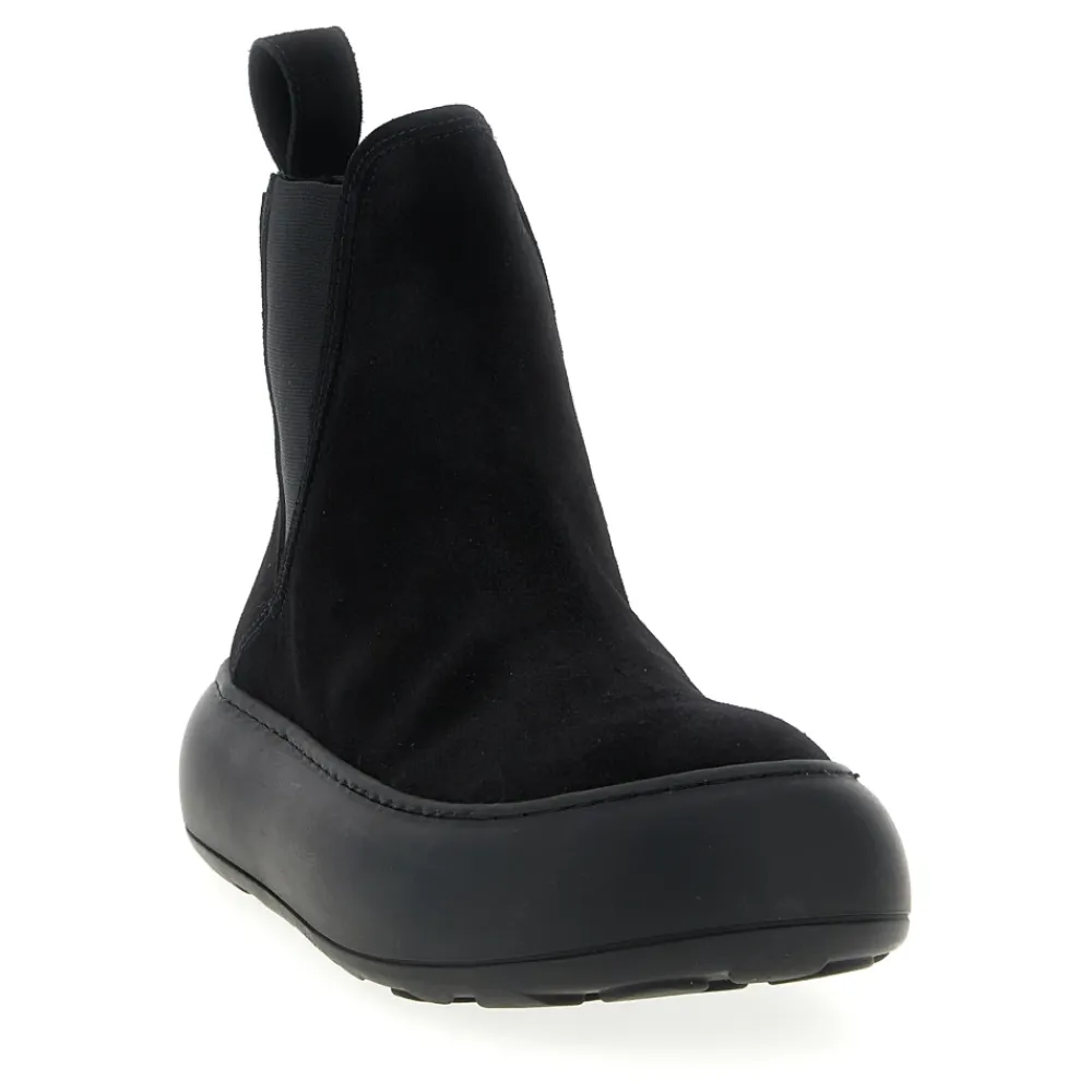 Moschino Ollie Sneakers kombinerer en skulpturel, afrundet tå med elastiske ankelindsatser og en chunky, letvægtssål for et løftet hverdagslook. Designet balancerer dristig volumen med raffinerede detaljer i kalveskindslæder. Vigtigste egenskaber: Sort | Kalveskindslæder | Letvægts, dobbeltstøbt sål | Elastiske ankelindsatser | Snørelukning | Afrundet tå | Chunky sål med polka-dot motiv på sålforet | Præget logo på hælen | Dimensioner & pasform: Hælhøjde: 5 cm | Italienske størrelser | Let udvidet silhuet | Sammensætning & pleje: Overdel: 100% Kalveskindslæder | Foring: 100% Kalveskindslæder | Sål: 100% Gummi