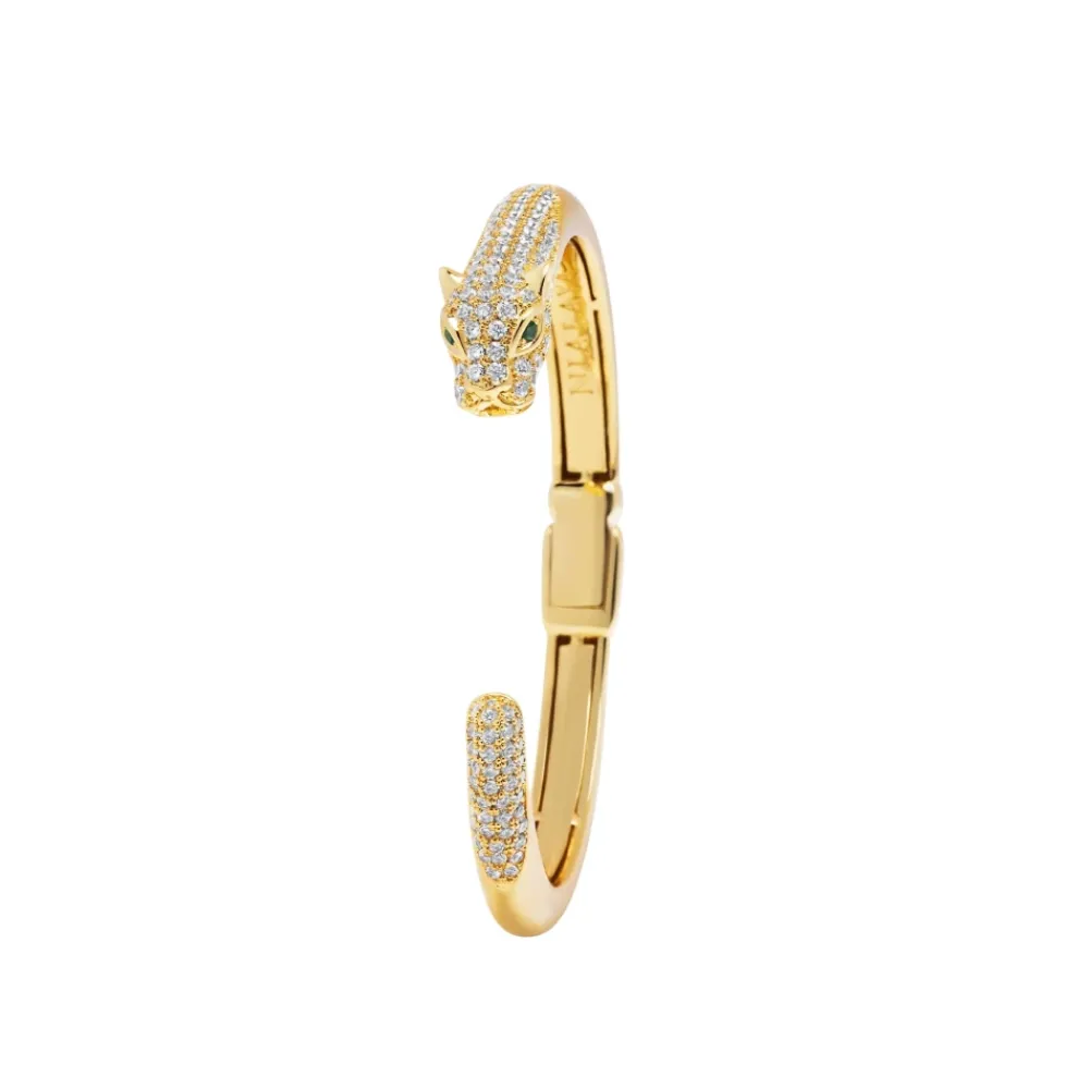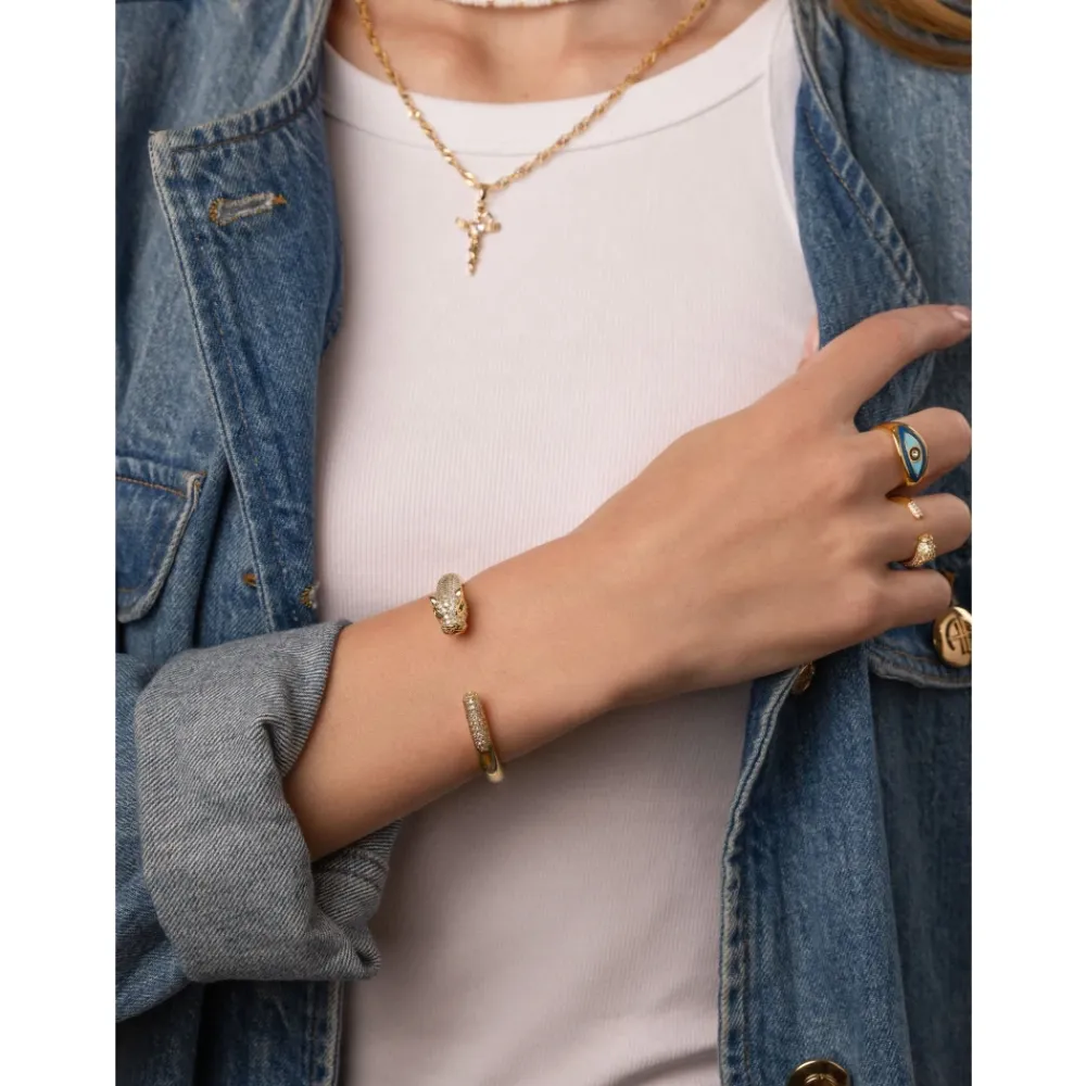 Nialaya Panther Cuff Bangle kombinerer et skulpturelt pantermotiv med funklende CZ-accenter på en guldbelagt manchet i rustfrit stål, designet til at løfte både afslappede og formelle looks. Vigtige egenskaber: Gul | Guld | Rustfrit stål | Pantermotiv | Cubic zirconia-accenter | Guldbelagt finish | Manchet silhuet | Intrikate håndlavede detaljer | Sammensætning og pleje: Rustfrit stål | Guldbelægning | Cubic zirconia