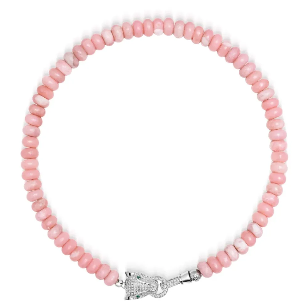 8mm Pink Opal Beads Lock and Pendants in Stainless Steel Clear and Green Cubic Zirconia Length: 14 Inches Product Code: WNECK_321 Designer’s Notes Hand-strung in our LA studio, this choker features smooth 8mm pink opal beads for a soft, radiant glow. At its center sits a bold CZ adorned panther head, designed to be worn in front—an unexpected detail that makes this piece stand out whether worn solo or layered. The panther symbolizes strength, protection, and quiet power. Across cultures—from ancient legends to modern meaning—it represents courage, confidence, and fierce independence. Please note that all our pieces are crafted by hand and one-of-a-kind, and may therefore vary slightly in size, shape, and color.