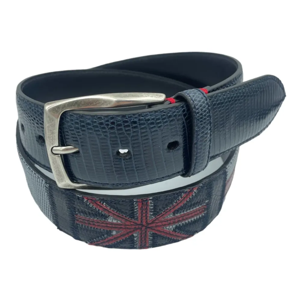 Paolo Vitale bælte fremstillet af firbenlæder med dekorative flagmotiver og et solidt messing spænde. Håndlavet i Italien for et raffineret, markant tilbehør. Vigtige egenskaber: Blå | Navy | Firbenlæder | Solid messing spænde | Flagmotiv | Håndlavet i Italien | Sammensætning & pleje: Firbenlæder | Messing