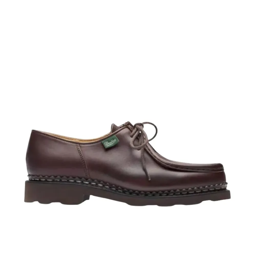 Paraboot damesnøgler i Derby-stil, model Michael Griff II Marron – lis cafe, med ornamentalt reliefbånd på vristen, 2 øjer. Foret med læder, norsk konstruktion på ægte gummisål. Lavet af 100% kalveskindsoverdel og 100% gummisål.